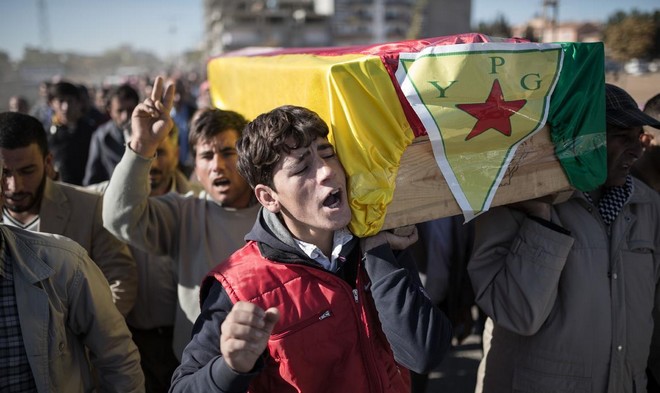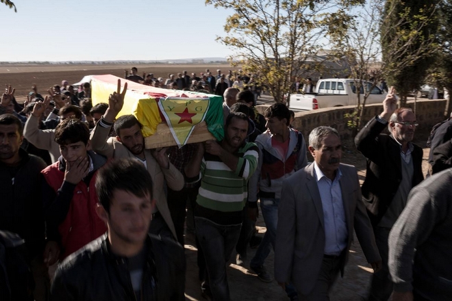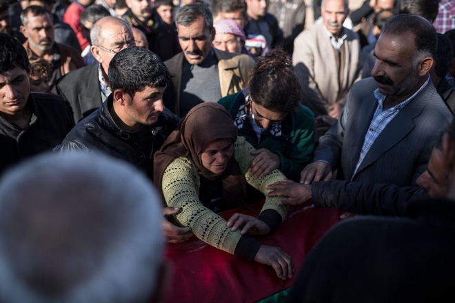 People mourn in front a coffin of People's Protection Units, or YPG, fighter killed during fighting with Islamic State forces in the Syrian town of Kobane, during a funeral in Suruc, near the Turkey-Syria border, November 6, 2014.