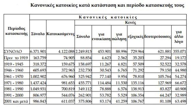 Οι οικονομολόγοι της Alpha Bank που επεξεργάστηκαν τα στοιχεία της ΕΛΣΤΑΤ, επισημαίνουν πως στις δεκαετίες του 1990 και του 2000 αυξήθηκαν σημαντικά οι κατοικίες που είναι κενές και δεν αξιοποιούνται, οι δευτερεύουσες ή εξοχικές κατοικίες, και οι κατοικίες που προορίζονται για ενοικίαση ή για πώληση.