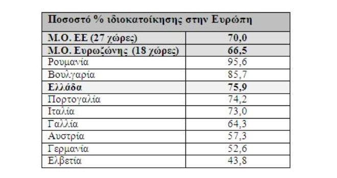 Σύμφωνα με τα στοιχεία που έδωσε πρόσφατα στη δημοσιότητα η Ελληνική Στατιστική Αρχή, η πλειοψηφία των Ελλήνων διαμένουν σε σπίτια ιδιόκτητα και μάλιστα χωρίς οικονομικά βάρη προς τις τράπεζες (67% τo 2011).