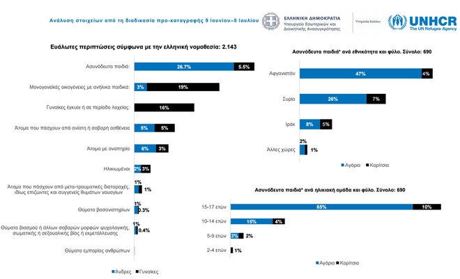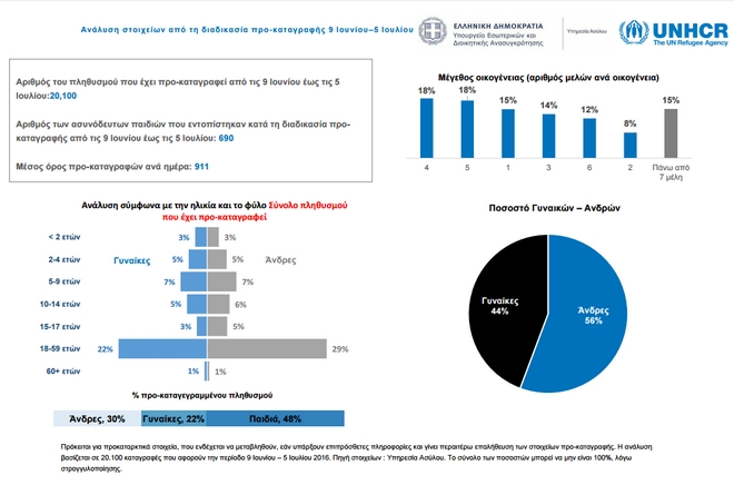 Πρόκειται για τα στοιχεία που προκύπτουν από την καταγραφή που έγινε για την περίοδο από τις 9 Ιουνίου έως τις 5 Ιουλίου και αφορά σε 20.100 άτομα. Όπως προκύπτει, σχεδόν ένας στους δύο πρόσφυγες (ποσοστό 48%) είναι ανήλικοι, εκ των οποίων 690 είναι ασυνόδευτα παιδιά.