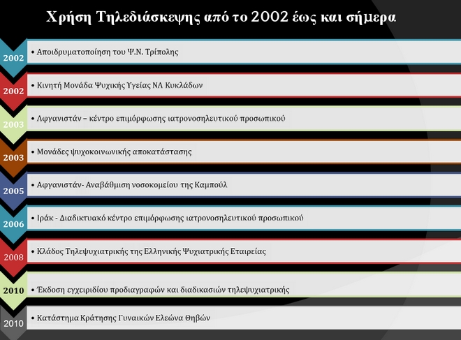 Σταδιακά, από το 2003 και μετά, η τηλεψυχιατρική εντάθηκε και στις μονάδες ψυχοκοινωνικής αποκατάστασης, ενώ το 2010 δημιουργήθηκε το πρότυπο ιατρείο τηλεψυχιατρικής εντός του Καταστήματος Κράτησης Γυναικών στον Ελεώνα Θηβών. Κατά τα έτη 2003 – 2013, δεκάδες επαγγελματίες ψυχικής υγείας συμμετείχαν στα πρόγραμμα.