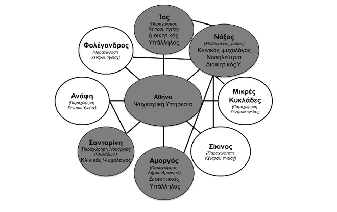 Μέχρι στιγμής, το δίκτυο τηλεψυχιατρικής καλύπτει τις μονάδες Ψυχικής Υγείας σε Νάξο, Σαντορίνη, Αμοργό και Ίο, τις Μονάδες Ψυχοκοινωνικής Αποκατάστασης σε Πάτρα και Κέρκυρα, καθώς και το Κατάστημα Κράτησης Γυναικών στον Ελεώνα Θηβών. «Ουσιαστικά συνδεόμαστε τηλεφωνικά με όλα αυτά τα σημεία, βλέπουμε περιστατικά συχνά, χορηγούμε φάρμακα και συνταγές, συζητάμε, προλαμβάνουμε, θεραπεύουμε. Στα νησιά του Αιγαίου άλλωστε, υπήρχαν ανέκαθεν περιορισμένες αναπτυξιακές δομές και συχνά προβληματική, μη καθημερινή πρόσβαση λόγω των δυσμενών καιρικών συνθηκών και του ελλιπούς ακτοπλοϊκού δικτύου. Γεγονός που δυσχεραίνει την πρόσβαση των κατοίκων των νησιών στις υπηρεσίες ψυχικής υγείας. Είναι χαρακτηριστικό ότι ακόμα και στα μεγαλύτερα από τα νησιά της ακτίνας δράσης, όπως η Νάξος και η Σαντορίνη, υπήρχε παντελής απουσία επαγγελματιών ψυχικής υγείας. Όσοι κάτοικοι χρειάζονταν ψυχιατρική περίθαλψη έπρεπε να επισκεφθούν το Νοσοκομείο της Σύρου ή υπηρεσίες της Αθήνας. Στο υπό κατασκευή νοσοκομείο, έχει γίνει πρόβλεψη για έναν ψυχίατρο. Μακάρι να στείλουν», αναφέρει ο κ. Κατσαδώρος.