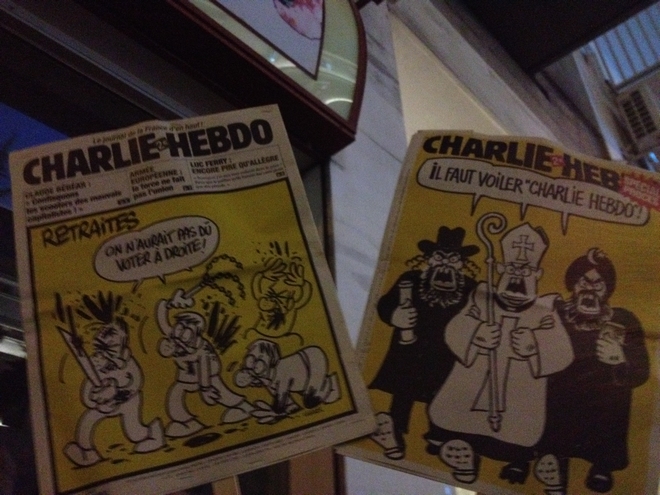Πολλές εφημερίδες, από τις Βρυξέλλες μέχρι την Κινσάσα και από τη Γενεύη μέχρι το Χονγκ Κονγκ, την Ιερουσαλήμ και το Σίδνεϊ, δημοσίευσαν σκίτσα των γελοιογράφων τους, συχνά δίπλα σε παλαιότερα σκίτσα του Charlie Hebdo.