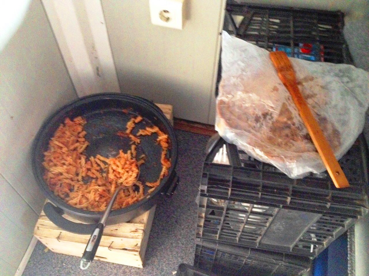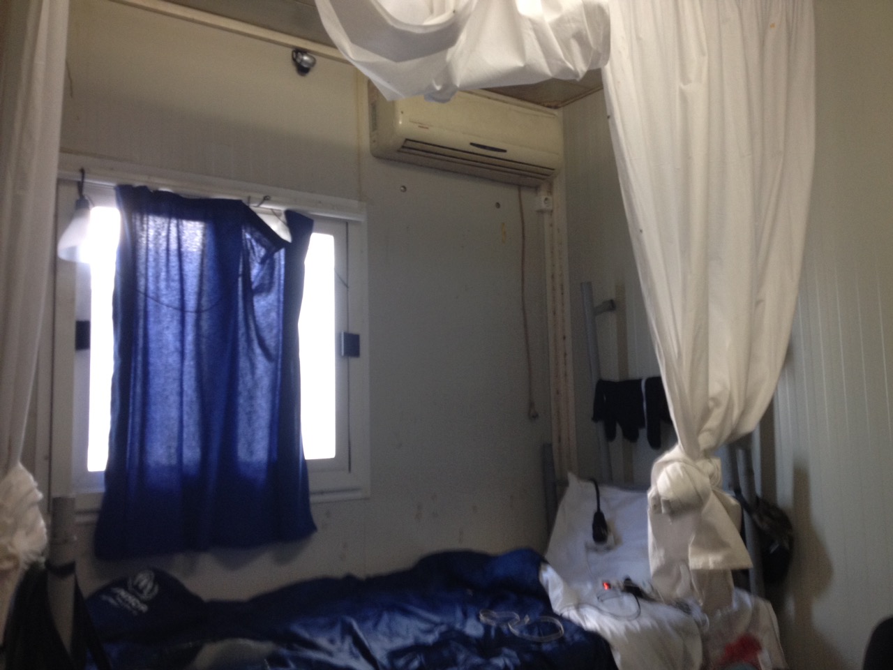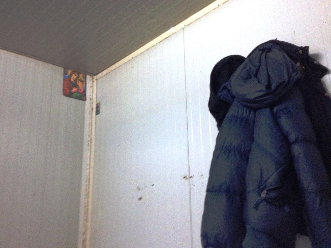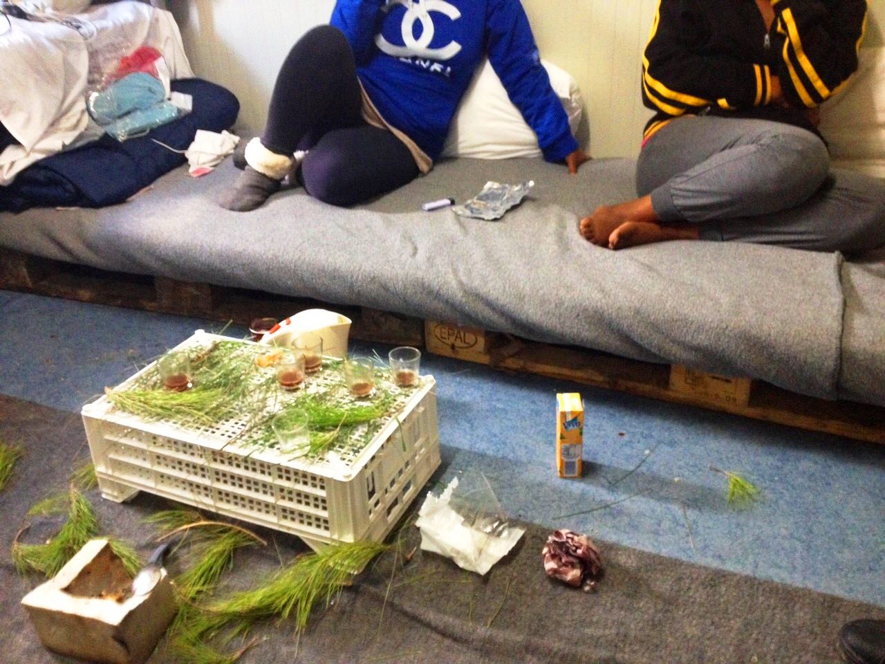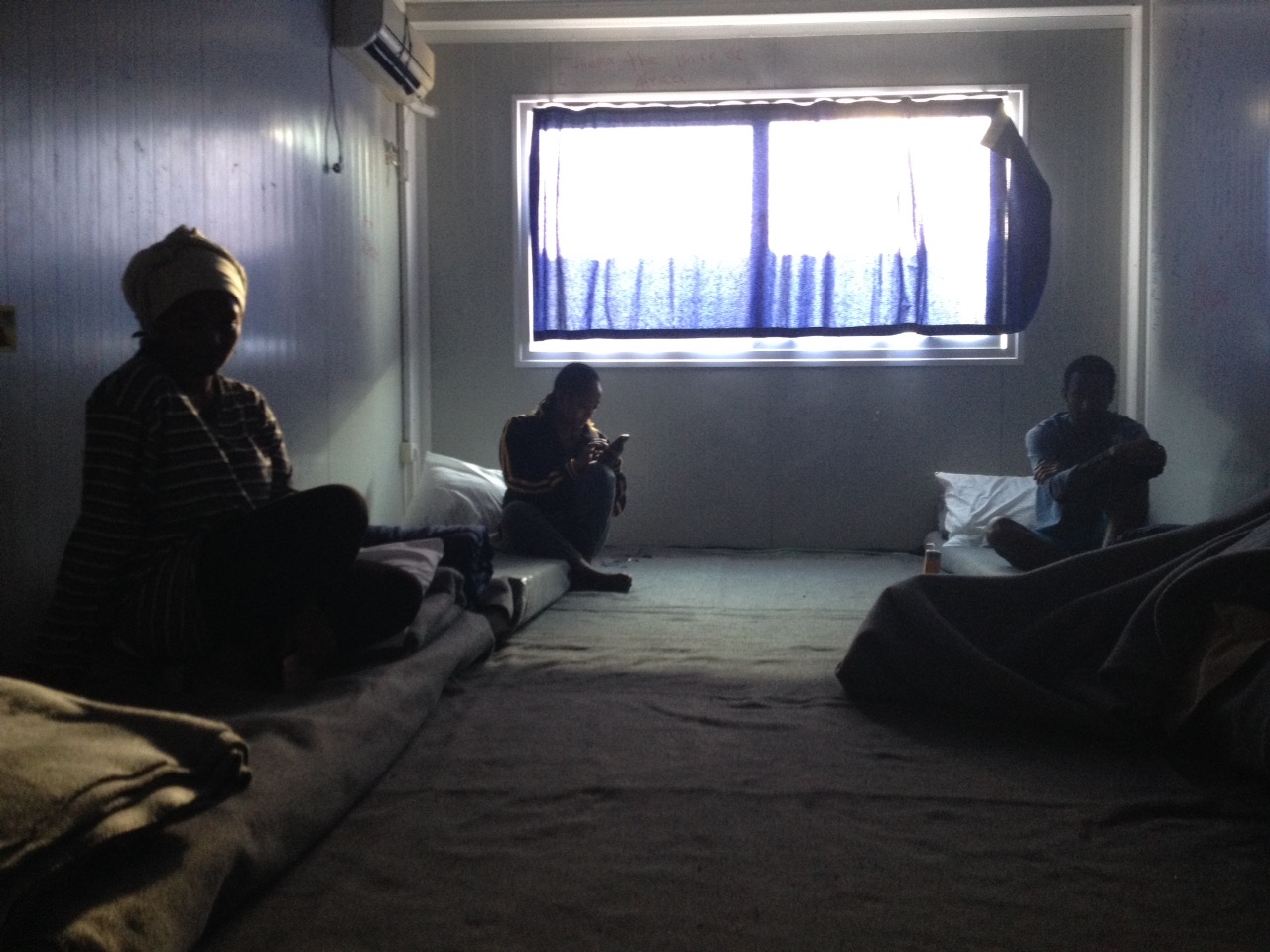 Το μικρό δωμάτιο έχει ένα κρεβάτι, στρώματα γύρω γύρω στο πάτωμα και στο κέντρο ένα τραπεζάκι γι’ αυτό που μεταξύ τους αποκαλούν “coffee ceremony”. Δίπλα ένα αυτοσχέδιο μικροσκοπικό μαγκάλι, το οποίο ανάβουν -όπως λένε- όταν κάνει πολύ κρύο. Σήμερα έφαγαν μπιφτέκι με ζυμαρικά. «Το καλύτερο από τα φαγητά που μας δίνουν τρώγεται με δυσκολία. Είναι κατεψυγμένο, δεν ξέρω για πόσο καιρό, και το βάζουν έτσι με το πλαστικό μέσα στο φούρνο. Πιάσε το, είναι ζεστό. Εσύ βάζεις το πλαστικό στο φούρνο;».
