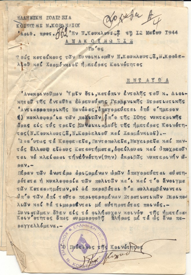 Διαταγή απαγόρευσης της κυκλοφορίας στους οικισμούς τής Κοινότητας Ν. Κορδελιού, κατόπιν εντολής τού Διοικητή τής γερμανικής αντιαεροπορικής μονάδας, 12.5.1944 (Αρχείο εγγράφων Δήμου Κορδελιού-Ευόσμου)
