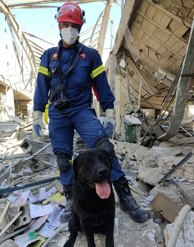 Ο επικεφαλής της αποστολής δεν ξέχασε φυσικά να αναφερθεί και στην πολύτιμη βοήθεια του 13ου μέλους της ομάδας, του διασωστικού σκύλου, του Ρούντι, ο οποίος βοήθησε σημαντικά την ομάδα να αποκλείσει την περιοχή σχετικά γρήγορα. Μάλιστα, για να καταλάβει κανείς τη σημασία του να έχεις διασωστικό σκύλο σε μια τέτοια αποστολή, ο κ. Καλοβρεντής, μας έφερε το παράδειγμα άλλων ειδικών ομάδων που βρίσκονταν στο σημείο (οι οποίες δεν είχαν σκύλο μαζί τους) και το πρώτο πράγμα που ζητούσαν ήταν ένας σκύλος από τις υπόλοιπες ομάδες. Ο ”Ρούντι” με την όσφρησή του μπορεί να διακρίνει εάν υπάρχει κάποιος επιζών.