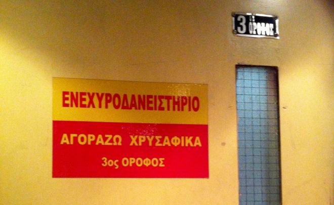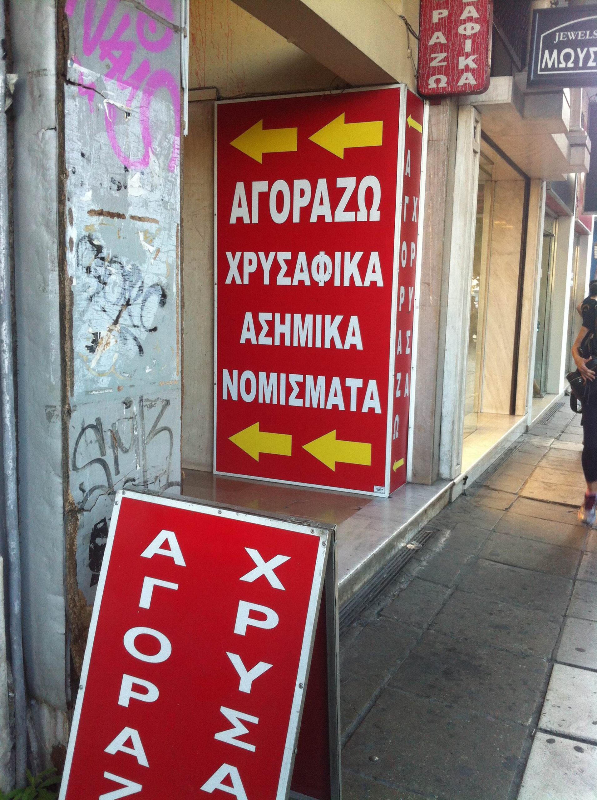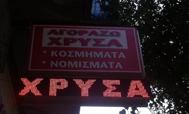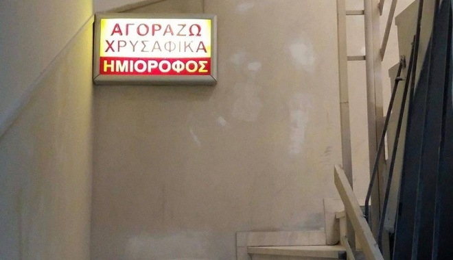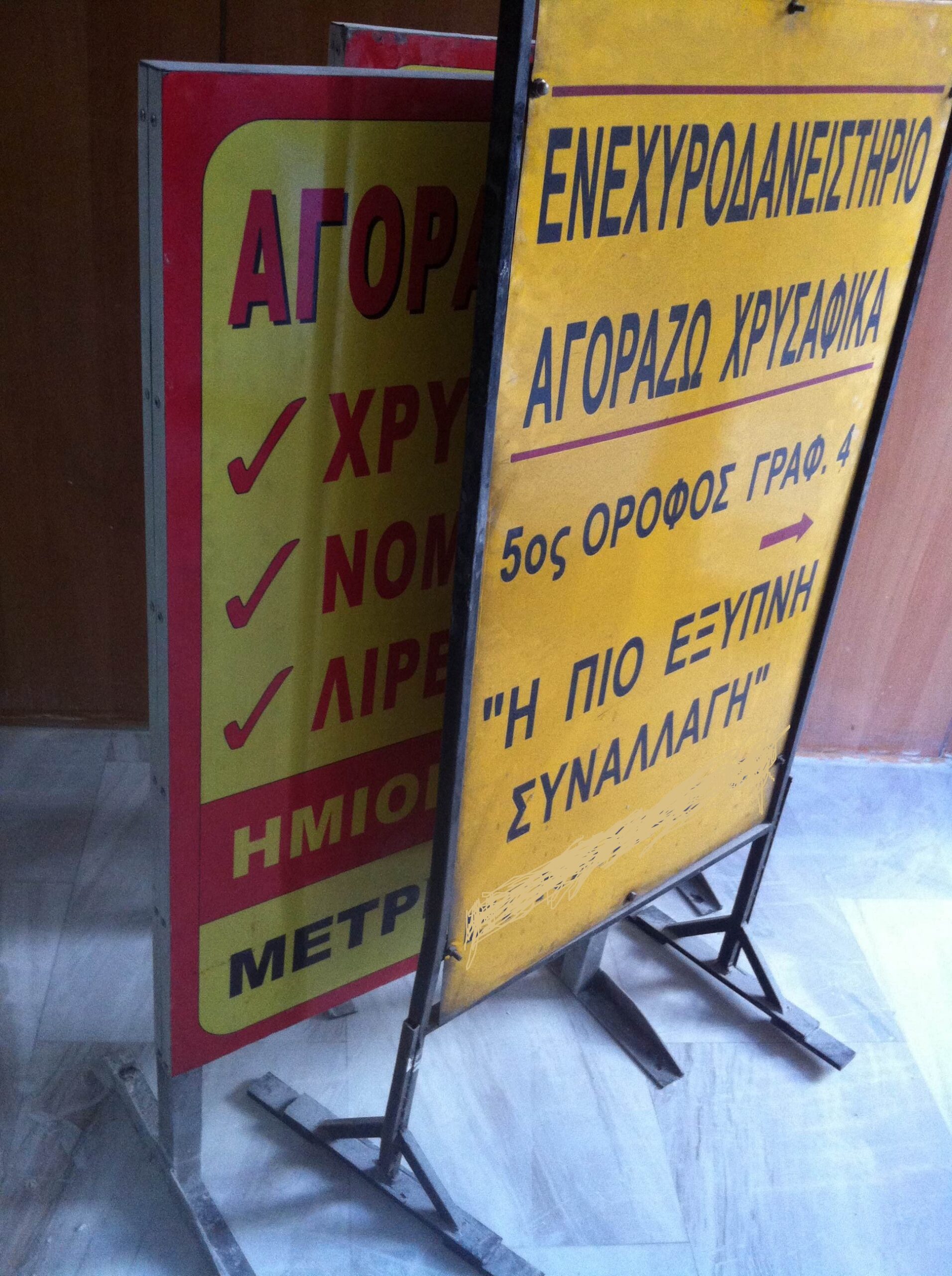 Υπάρχει όμως και μια νεότερη κατηγορία καταστημάτων αγοράς χρυσού που χρησιμοποιεί διαφορετική πελατειακή προσέγγιση: στα ισόγεια και όχι στους ορόφους των πολυκατοικιών, με μεγάλες φωτεινές επιγραφές και έντονα γραφιστικά που καλύπτουν ολόκληρες τις βιτρίνες τους, παρουσιάζοντας πλάκες χρυσού και πάκους χαρτονομισμάτων. Αργότερα θα διαπίστωνα πως τα ισόγεια που παραπέμπουν περισσότερο σε μαγαζιά ή σε ανταλλακτήρια, λειτουργούν επί το πλείστον με νεαρούς υπαλλήλους, ενώ στους ορόφους οι αγορές χρυσού έχουν το στήσιμο γραφείων, όπου μας υποδέχονται οι ίδιοι οι ιδιοκτήτες σε μικρούς χώρους με δερμάτινες πολυθρόνες και μεγάλα χρηματοκιβώτια σε κοινή θέα.
