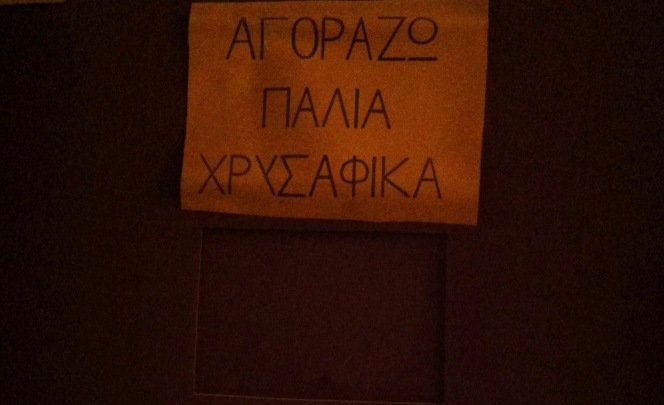 “Αγοράζω χρυσαφικά”: Το πρώτο πρόσωπο που χρησιμοποιούν στις επιγραφές τους οι περισσότεροι αγοραστές χρυσού, πιθανότατα στοχεύει στη δημιουργία μιας αίσθησης οικειότητας και εχεμύθειας. Στο μυαλό μου όμως λειτουργεί αντιθετικά και με παραπέμπει σε συνειρμικές εικόνες σκοτεινής αγοραπωλησίας. Το αίσθημα αυτό ενισχύεται από το γεγονός ότι οι περισσότερες από τις πινακίδες τους οδηγούν σε ορόφους και ημιορόφους ταλαιπωρημένων πολυκατοικιών της Εγνατίας, περιοχή που εδώ και περίπου μια δεκαετία έχει υποστεί μια συνεχή υποβάθμιση, εξαιτίας των έργων του πολυπαθούς μετρό.