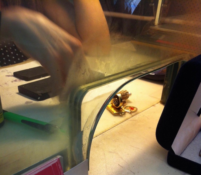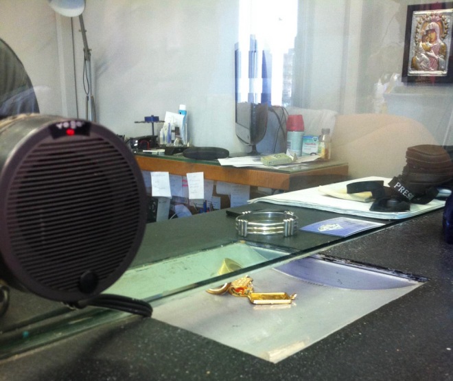 Θέλοντας να δω πώς ακριβώς λειτουργεί αυτή η αγορά εκ των έσω, και όχι μέσω του νομικού της πλαισίου, αποφάσισα να την επισκεφτώ ως πελάτισσα. Μόνη μου στην αρχή, με ένα πλαστικό κουτί κοσμημάτων (απροσδιόριστης οικονομικής και συναισθηματικής αξίας) από αυτά που κάθε ελληνική οικογένεια διαθέτει στα συρτάρια της αποφάσισα να ξεκινήσω από τα ισόγεια και άνοιξα την πρώτη πόρτα που βρέθηκε στον δρόμο μου. Η σύντομη συνομιλία με τον νεαρό άντρα έγινε με ένα προστατευτικό τζάμι ανάμεσά μας, ενώ όταν έβγαλα τα κοσμήματα για εκτίμηση εμφανίστηκε και ένας δεύτερος, μάλλον πιο έμπειρος αν κρίνω από την ταχύτητά του. Έπαιρνε ένα ένα τα κοσμήματα και τα έτριβε σε μια μαύρη πέτρα προκειμένου να διαπιστώσει την καθαρότητα του χρυσού, που όπως είναι γνωστό μετριέται σε καράτια. Ο χρυσός άφηνε ένα ελαφρύ ίχνος πάνω στην πέτρα. Στη συνέχεια έριχνε ένα υγρό από πάνω. “Οξύ”, μου απάντησε η μοναδική γυναίκα που συνάντησα σε ένα άλλο ισόγειο κατάστημα λίγη ώρα αργότερα. «Ρίχνουμε μια σταγόνα πάνω στο ίχνος. Ξεκινάμε από οξύ 9Κ και εάν δεν αντιδράσει προχωράμε στο υψηλότερο, πχ 14Κ. Όταν υπάρξει αντίδραση σημαίνει πως το χρυσό είναι λιγότερων καρατίων από τη δύναμη του οξέως». Το τζάμι δυσκόλευε την εξέλιξη της συζήτησης, όπως και το γεγονός ότι στεκόμουν όρθια σαν να είχα έρθει επίσκεψη σε μια ιδιότυπη τράπεζα. Σε συνδυασμό με τα πενιχρά χρυσαφικά μου -το πολυτιμότερο ήταν μια καδένα 18Κ και κοστολογούνταν στα 300 ευρώ- αποφάσισα να προσανατολιστώ στα γραφεία όπου το στήσιμο του χώρου βοηθούσε περισσότερο στην εξέλιξη της συζήτησης.