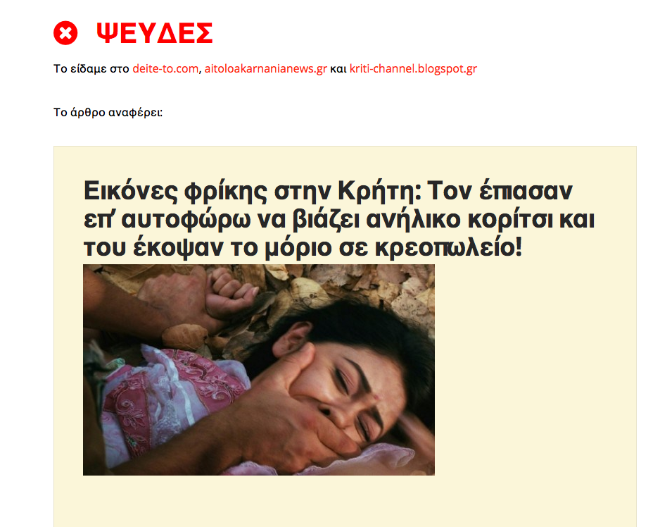 Του έκοψαν το μόριο: Η είδηση δεν έχει ούτε ένα μόριο αλήθειας, παρότι χρησιμοποιεί αληθινά ονόματα – πλην της Ροδόπολης Χανίων που, όταν οι συγγραφείς ανακάλυψαν ότι δεν υπάρχει, έγινε Κίσσαμος. Οι εμπνευστές του hoax προσάρμοσαν στην ελληνική πραγματικότητα μια είδηση που αφορούσε βιασμό στην Ινδία. Και σε αυτή την περίπτωση, όμως, ο ακρωτηριασμός του δράστη δεν επιβεβαιώθηκε.