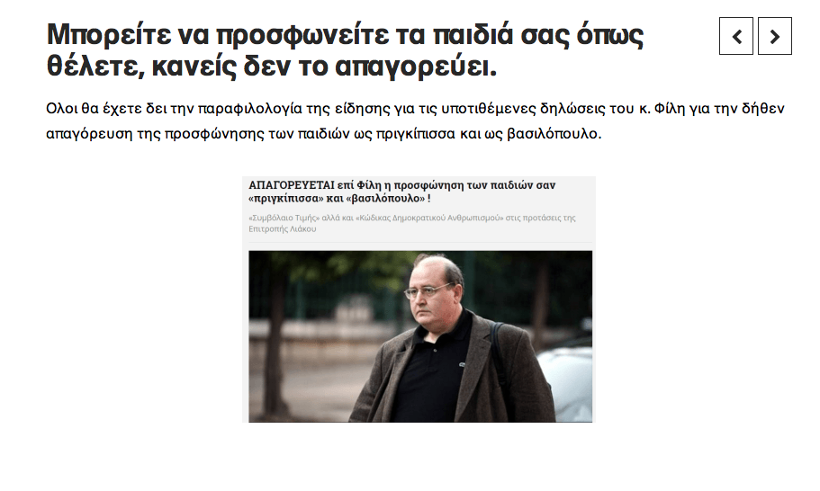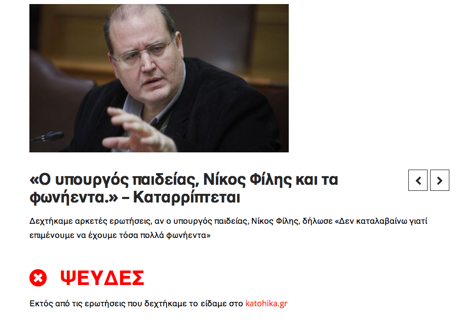 Εκτός από την κριτική που εισπράττει για όσα έχει όντως δηλώσει ή εξαγγείλει, ο Νίκος Φίλης δέχεται τον τελευταίο καιρό βολές και για πράγματα που ουδέποτε ξεστόμισε: ότι θέλει να καταργήσει τα αρχαία και τα θρησκευτικά, ότι απαγορεύει τις προσφωνήσεις «πριγκίπισσα» και «βασιλόπουλο», ότι του κάθονται στο στομάχι τόσα πολλά φωνήεντα στο ελληνικό αλφάβητο και σκέφτεται να «κουρέψει» μερικά για να απλοποιηθεί η γλώσσα. Στις πρώτες περιπτώσεις, παραποιήθηκαν ή απλουστεύτηκαν οι θέσεις του. Η τελευταία είδηση, όμως, αυτή που τον ήθελε να προτείνει την κατάργηση των φωνηέντων, είναι καθαρό hoax. Δημοσιεύτηκε στη σατιρική ιστοσελίδα «Το Κουλούρι», αλλά ο Άδωνις Γεωργιάδης την πήρε στα σοβαρά και, από την τηλεοπτική εκπομπή του αδερφού του, περιποιήθηκε όχι μόνο το Φίλη αλλά και όσους τον ψήφισαν.