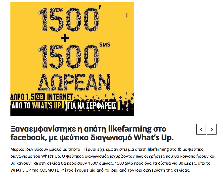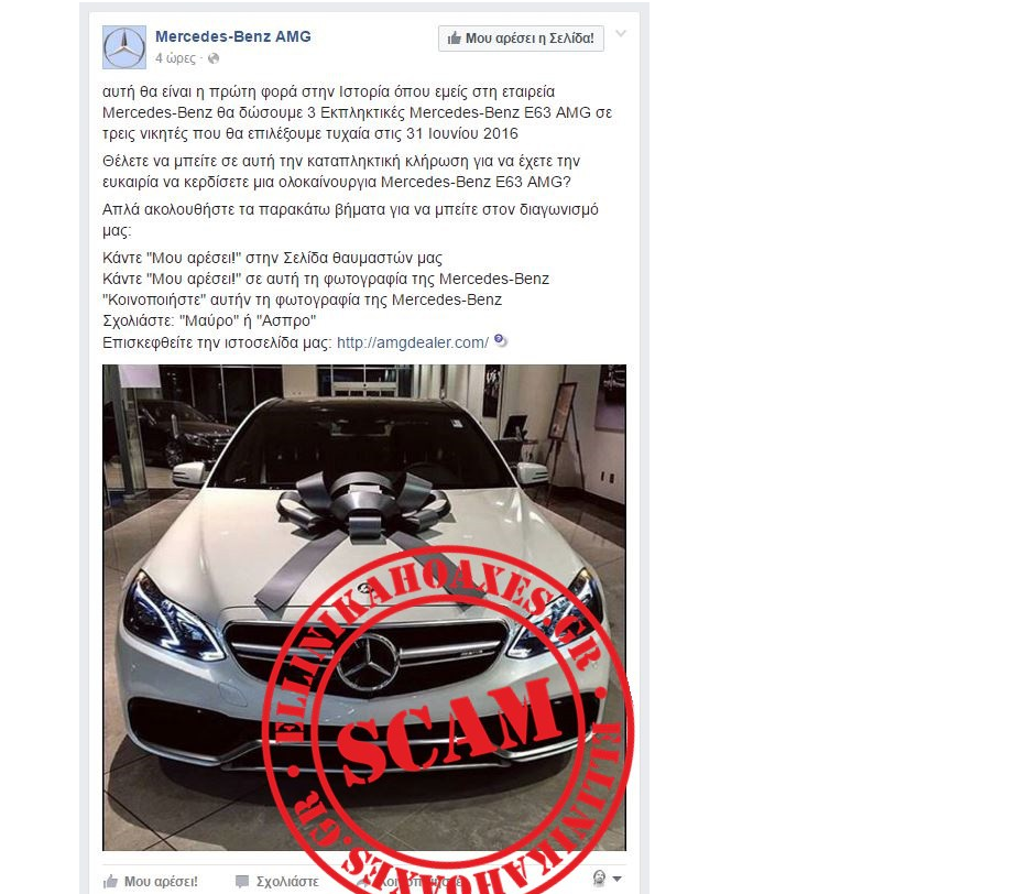 Fake διαγωνισμός που εμφανίστηκε πρόσφατα σε σελίδα του facebook, δήθεν ενταγμένη στο δίκτυο της Mercedes, ;έταζε σε όσους κάνουν like συμμετοχή σε κλήρωση με δώρο 3 αυτοκίνητα. Κλασική περίπτωση «like farming», μόνο που οι δεκάδες χιλιάδες επισκέπτες που «τους άρεσε», γνωρίζουν μόνο το like – κι έτσι μαζεύονται κοπαδηδόν στη «φάρμα» των απατεώνων.