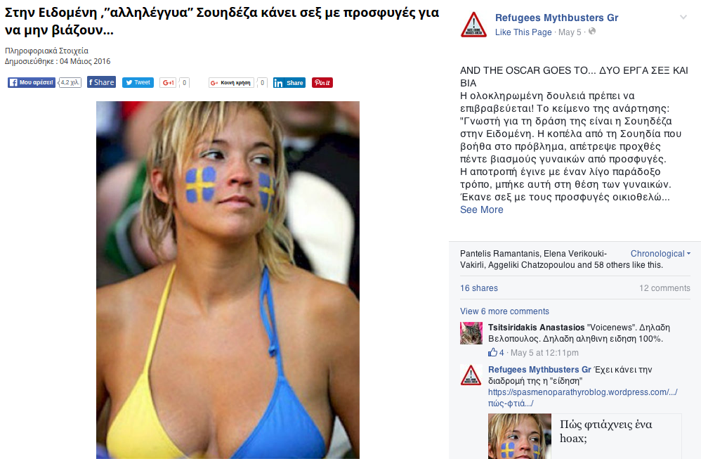Οι ψεύτικες ειδήσεις φυσικά συνδέονται με την επικαιρότητα και για αυτό όσες αφορούν το προσφυγικό είναι αυξημένες τους τελευταίους μήνες. «Παίρνουν ένα υπαρκτό έγκλημα από κάποιον μετανάστη και το ανακυκλώνουν σε διάφορες παραλλαγές», λέει ο Θοδωρής Δανιηλίδης. «Και προωθούν, υποδαυλίζουν, συντηρούν το μίσος», τονίζει ο κύριος Σαραντάκος. «Όπως το δημοσίευμα του Στόχου που είχε φωτογραφία μιας σουηδέζας φιλάθλου και ισχυριζόταν ότι πήγε στην Ειδομένη και τη βίαζαν οι πεινασμένοι μετανάστες». Και συμπληρώνει, ότι οι απλουστεύσεις βοηθούν τη διάδοση των πιο αισχρών ψεμάτων, ενώ το ίδιο το μέσο από τη μία φέρνει σε επαφή ανθρώπους με κοινά ενδιαφέροντα κι από την άλλη δίνει τη δυνατότητα σε όσους μοιράζονται απαράδεκτες ιδέες να συναναστραφούν μεταξύ τους χωρίς να ντρέπονται».