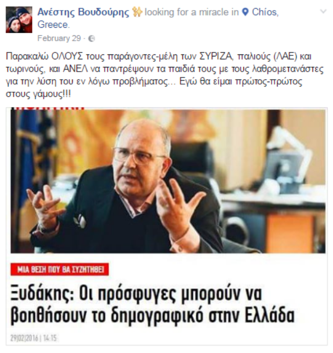 Όσο για τον μισαλλόδοξο λόγο του κυρίου Βουδούρη, θα μπορούσε κανείς να υποθέσει ότι πηγάζει από τα δεινά που έχει προκαλέσει στον ίδιο και τους υπόλοιπους κατοίκους του Κάστρου ο εγκλωβισμός προσφύγων και μεταναστών στον γειτονικό τους καταυλισμό της Σούδας και τα επαναλαμβανόμενα επεισόδια στην περιοχή. Για τον κύριο Βουδούρη ωστόσο, οι πρόσφυγες και οι μετανάστες ήταν λαθρομετανάστες πολύ πριν την υπογραφή της συμφωνίας ΕΕ – Τουρκίας και των συνακόλουθων προβλημάτων που έφερε ο εγκλωβισμός τους στο νησί.