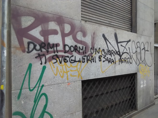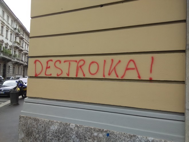 “Όχι στην Έκθεση” και “η Έκθεση σημαίνει χρέος” ήταν τα συνθήματα που συναντήσαμε περισσότερο στο δρόμο. Βασικότεροι στόχοι των αντιεξουσιαστών οι τράπεζες που μετρούν σήμερα τις ζημίες τους. “Κοιμηθείτε, κοιμηθείτε τη μέρα που θα θέλετε να ξυπνήσετε θα είστε νεκροί” λέει άλλου στο γκράφιτι, αλλά και ο “Ρεντσι είναι μαφιόζος”.