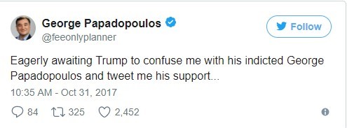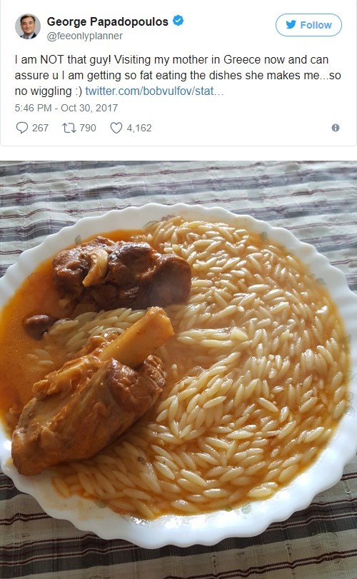 Αφού πέρασε η πρώτη καταιγίδα και δόθηκαν οι απαραίτητες εξηγήσεις, ο κ. Παπαδόπουλος αποφάσισε να δεν τη χιουμοριστική πλευρά της ιστορίας. Πρώτα ανέβασε στο twitter μια φωτογραφία από το γιουβέτσι του και έγραψε: “ΔΕΝ είμαι αυτός ο τύπος. Επισκέπτομαι τη μητέρα μου στην Ελλάδα και παχαίνω με τα φαγητά που μου φτιάχνει”. Και λίγη ώρα αργότερα τα έβαλε με τον ίδιο τον πρόεδρο των ΗΠΑ, γράφοντας: “Περιμένω με ανυπομονησία πότε θα με μπερδέψει ο Τραμπ με τον δικό του κατηγορούμενο Γιώργο Παπαδόπουλο και θα μου στείλει στο twitter την υποστήριξη του”.