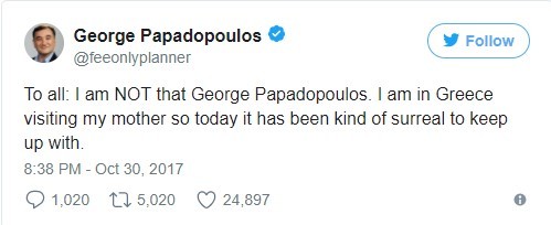 Αυτή είναι μια από τις πολλές αναρτήσεις που έκανε στο twitter o οικονομικός σύμβουλος Γιώργος Παπαδόπουλος, για να εξηγήσει σε χιλιάδες ανθρώπους ότι έχει πέσει θύμα παρεξήγησης και ότι δεν είναι ο συνονόματος του πρώην σύμβουλος του Ντόναλντ Τραμπ.