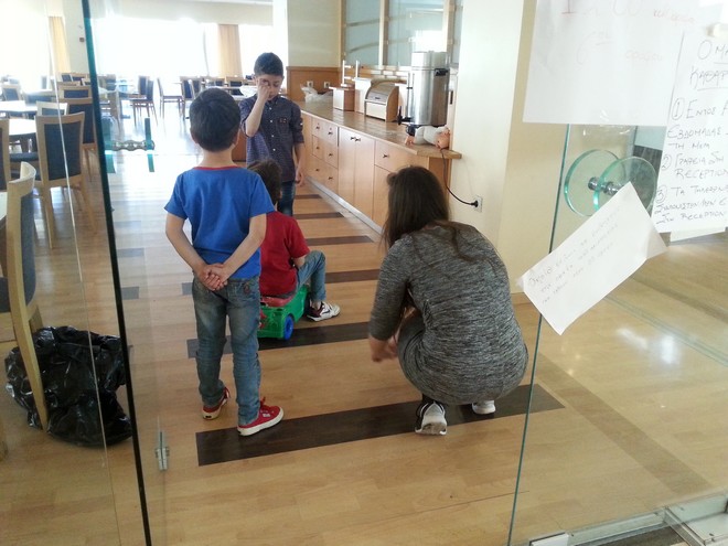 Μετά την ενδιαφέρουσα συζήτηση και τις απαραίτητες συστάσεις η κα. Γεωργία Νικολοπούλου ανέλαβε να μας ξεναγήσει στους χώρους του ξενοδοχείου που έχουν μέχρι τώρα αξιοποιηθεί. Σεβόμενοι την επιθυμία της Πρωτοβουλίας Αλληλεγγύης δεν καταγράφηκαν πρόσωπα προσφύγων ούτε οι ίδιοι στα δωμάτια τους με το επιχείρημα ότι μετά από καιρό οι άνθρωποι αυτοί βρήκαν έναν ελάχιστο ιδιωτικό χώρο.