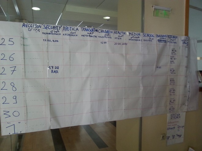 Σε καθημερινή βάση απασχολούνται εκεί πάνω από 100 άτομα χωρισμένα σε 12 ομάδες με ξεχωριστές αρμοδιότητες. Από τη reception και την καθαριότητα μέχρι τα μαγειρεία και τη συλλογή των προσφορών οι αλληλέγγυοι έχουν καταφέρει με βάρδιες να πετύχουν μια εξαιρετική οργάνωση του χώρου και των αναγκών αποτρέποντας την κατάληψη του κτηρίου να μετατραπεί σε χαοτική.