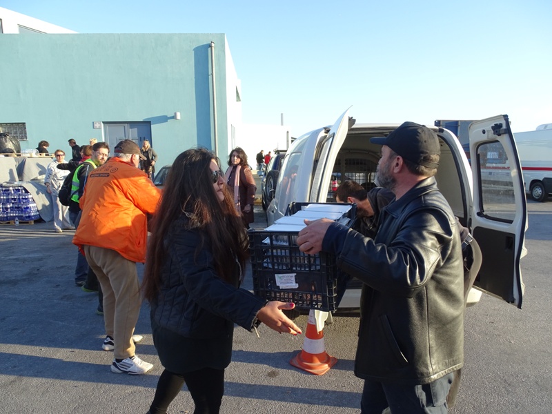 Όσο συζητάμε πλησιάζουν τέσσερα νεαρά κορίτσια και ρωτούν που πρέπει να αφήσουν τις τσάντες που κρατάνε. ” Είμαστε γιατροί, φέραμε φάρμακα και θα μείνουμε να βοηθήσουμε όποιον έχει ανάγκη“. Στη συνέχεια, ο Γιάννης, φαρμακοποιός από τη Λαμπρινή, μαζί με μια συνάδελφό του από τα Πατήσια. “Είδαμε στο Facebook τις λίστες με τις ανάγκες και προσπαθήσαμε να μαζέψουμε ό,τι μπορούσαμε. Ανταποκρίθηκαν κι άλλοι συνάδελφοι καθώς και πολλοί πελάτες μας. Επίσης, ο Φαρμακευτικός Σύλλογος Πειραιά βοηθάει πολύ. Φέραμε φάρμακα και τώρα πάμε να δώσουμε ρούχα και τρόφιμα”.