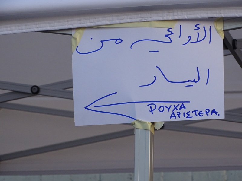 Στην αποθήκη συναντάμε την Άντρια, 22 ετών, φοιτήτρια στο Πάντειο. “Σήμερα ήρθα για πρώτη φορά να δω πώς είναι και έκατσα να ταξινομήσω τα πράγματα”. Πώς το αποφάσισε; “Για να πάω στη σχολή μου περνώ καθημερινά από τον Πειραιά και τους βλέπω. Τις προάλλες είδα ένα παιδάκι να κουβαλά μια τεράστια βαλίτσα. Δεν μπορούσα να μείνω άπραγη. Μπορεί να μην έχω το χρόνο να αφιερωθώ ολοκληρωτικά στον εθελοντισμό, αλλά μπορώ να διαθέσω πέντε ώρες, όπως έκανα σήμερα, για να βοηθήσω κάποιον που έχει ανάγκη. Και θα το ξανακάνω. Είναι άλλωστε πολύ ευχάριστο να συναναστρέφεσαι μαζί τους, γιατί είναι άνθρωποι ευγενικοί και χαρούμενοι. Παρά τα όσα έχουν περάσει οι περισσότεροι είναι με το χαμόγελο. Βλέπεις τη θέλησή τους για ζωή, θέλουν να φύγουν, ελπίζουν να φύγουν… Σήμερα γνώρισα τον Μοχάμεντ, είναι εντελώς μόνος του, η οικογένειά του έχει μείνει πίσω στη Συρία. Είναι φοιτητής, μηχανικός, και θέλει να συνεχίσει τις σπουδές του στη Γερμανία. Πήγε στα σύνορα και τον γύρισαν πίσω, αφού είναι κλειστά… Κι έτσι βρέθηκε εδώ. Ταξινομήσαμε μαζί τα πράγματα στην αποθήκη και μου μαθαίνει και αραβικές λέξεις, τις γράφει εδώ στο χαρτί!”.