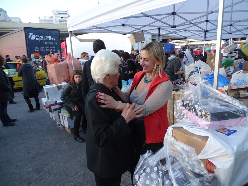 Κοντεύει να βραδιάσει και ο κόσμος εξακολουθεί να καταφθάνει. Μια εθελόντρια αγκαλιάζει μια ηλικιωμένη κυρία που ήρθε φορτωμένη πράγματα. Μας επιτρέπουν να απαθανατίσουμε τη στιγμή. Οι περισσότεροι άνθρωποι που μας μίλησαν δεν ήθελαν να φωτογραφηθούν, ούτε να γραφτεί το ονοματεπώνυμό τους. “Δεν έρχεται κανείς για να πάρει εύσημα”.