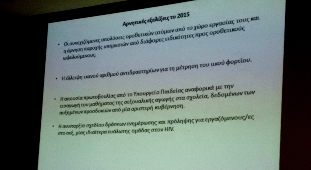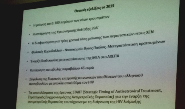 Ο διευθυντής της “Θετικής Φωνής” Γιάννος Λιβανός παρουσίασε τις θετικές και τις αρνητικές πτυχές των θεμάτων τα οποία σχετίζονται με τον HIV/AIDS για το 2015, ενώ ο διευθυντής του “Κέντρου Ζωής” Κωστής Χατζημωράκης παρουσίασε διεξοδικά όλες τις κοινές δράσεις των τριών ΜΚΟ για το 2015.