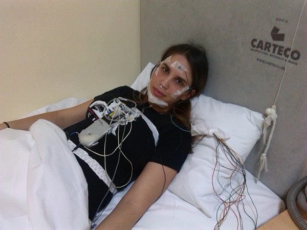 Μετά από περίπου ένα τέταρτο, ήρθε μια τεχνικός του εργαστηρίου, είπε στον συνάδελφό μου ότι έπρεπε να φύγει και άρχισε η “ετοιμασία” που είπε λίγο πριν. “Καθίστε, ίσια στη καρέκλα, για να σας καλωδιώσουμε”. Τότε άρχισε να κολλάει σε διάφορα σημεία του σώματός μου ευαίσθητα αισθητήρια όργανα, τα οποία καταγράφουν τα κύματα του εγκεφάλου, τη μυϊκή δραστηριότητα, την καρδιακή δραστηριότητα, την αναπνοή, την οξυγόνωση του αίματος και άλλες σωματικές λειτουργίες.