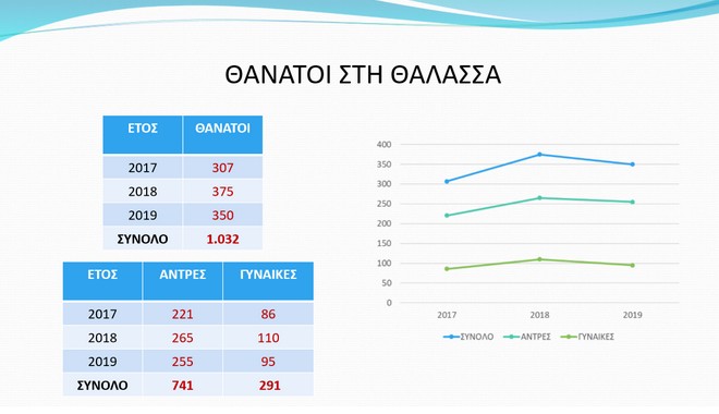 Πάμε τώρα να δούμε τι συμβαίνει στις ελληνικές παραλίες από το 2017 μέχρι και το 2019, με βάση τα στοιχεία του Λιμενικού και του Παρατηρητηρίου Ατυχημάτων. Αυτό κατέγραψε 307 θανάτους στη θάλασσα το 2017, 375 το 2018 και 350 το 2020. Μάλιστα, το 72% των ανθρώπων που έχασαν τη ζωή τους ήταν άντρες.
