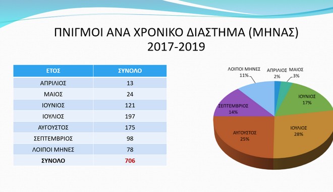 Όπως θα δείτε και σε σχετικό γράφημα, οι περισσότεροι πνιγμοί της τριετίας σημειώνονται τον μήνα που διανύουμε. Ο Ιούλιος έχει αποδειχτεί μοιραίος μήνας, με 197 πνιγμούς στις παραλίες από τους 706 της τριετίας. Κι αυτό, όμως, έχει εξήγηση, αφού όπως μας είπε ο κ. Μαρουλάκης: “Τότε είναι η έξαρση του κόσμου στις παραλίες. Βάσει των στοιχείων που έχουμε η μεγαλύτερη προσέλευση στις παραλίες σημειώνεται τον Ιούλιο“.