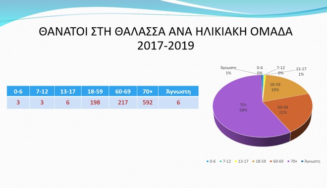 Οι ηλικιωμένοι άνθρωποι αποτελούν τη συντριπτική πλειοψηφία των θυμάτων στις ελληνικές θάλασσες και ακτές. Τα αίτια είναι είτε καρδιακά είτε παθολογικά, με πιο συχνά το έμφραγμα και την αναρρόφηση. Το σχετικό γράφημα που μας δόθηκε αναφέρει ότι το 58% των ανθρώπων που πεθαίνουν στη θάλασσα είναι 70 ετών και άνω, ενώ αν συμπεριλάβουμε και την αμέσως προηγούμενη ηλικιακή ομάδα (60-69 ετών) θα δούμε πως οι άνθρωποι ηλικίας 60 ετών και άνω που έχασαν τη ζωή τους στη θάλασσα είναι το 79% των συνολικών θανάτων. “Έχουμε ήδη δημιουργήσει τέσσερα σποτ που εφιστούν την προσοχή των ανθρώπων, ειδικά αυτής της ηλικιακής ομάδας, για τις συνθήκες και τους κινδύνους των ελληνικών θαλασσών”, τονίζει ο κ. Μαρουλάκης.
