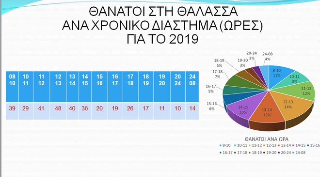 Κατά την περσινή χρονιά, το διάστημα 11 π.μ. με 3μ.μ. αποδείχτηκε το πιο επικίνδυνο, με την ώρα μεταξύ 12 και 1 μ.μ. να συγκεντρώνει τον μεγαλύτερο αριθμό θανατηφόρων ατυχημάτων. Αρκετά μεγάλος, όμως, ήταν και ο αριθμός των θανάτων στο διάστημα 8-10 π.μ. (39), με τον Διευθυντή της Λιμενικής Αστυνομίας να εξηγεί πως “αυτό το διάστημα είναι όπου προσέρχονται στις παραλίες ηλικιωμένοι κυρίως άνθρωποι. Γι’ αυτό αποφασίσαμε να επιμηκύνουμε το ωράριο της ναυαγοσωστικής κάλυψης στο νέο ΠΔ, πράγμα όμως που ξεκινά από φέτος. Έτσι, το ωράριο 10:30 π.μ. με 5:30 μ.μ. πλέον γίνεται 10 π.μ. 6 μ.μ. Όσο για τις μεσημβρινές ώρες, λέμε συνέχεια ότι χρειάζεται προσοχή στο φαγητό και στο ποτό”.