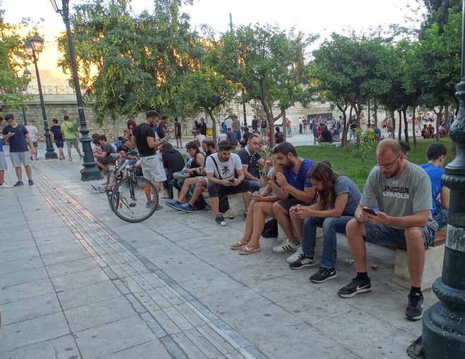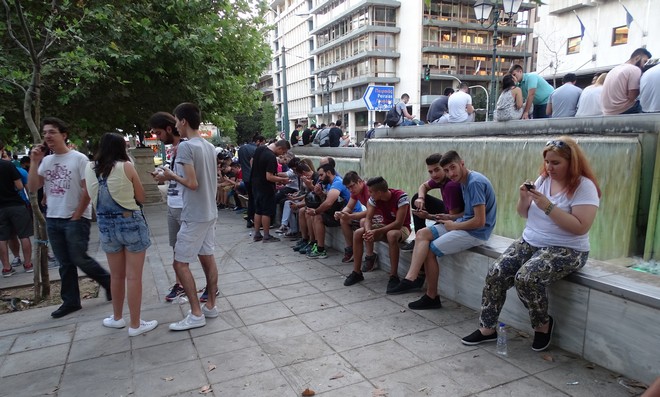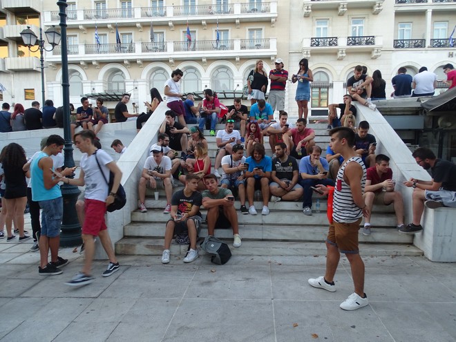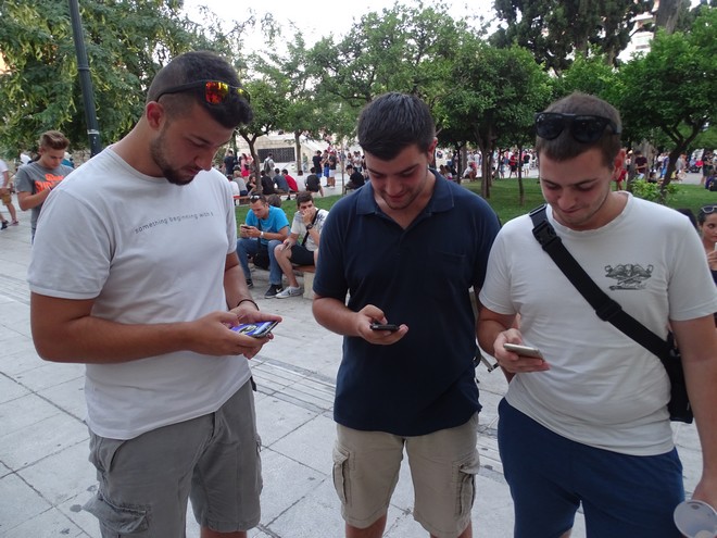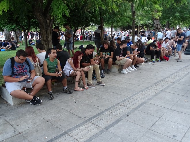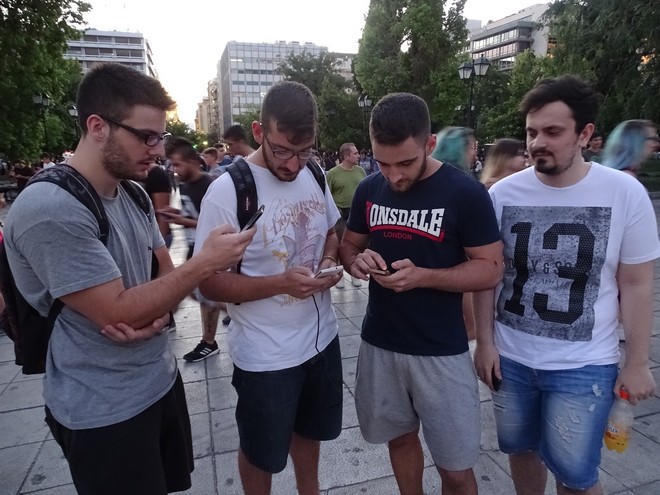 Δεν είναι όμως μια ακόμη συνηθισμένη μέρα με πολύ κόσμο στο κέντρο της Αθήνας, και αυτό διότι οι νέοι έχουν ακροβολιστεί σε κάθε γωνιά της πλατείας κοιτάζοντας τα κινητά τους τηλέφωνα με αγωνία και πλήρη ετοιμότητα. Τι κάνουν; Μα φυσικά παίζουν pokemon go!