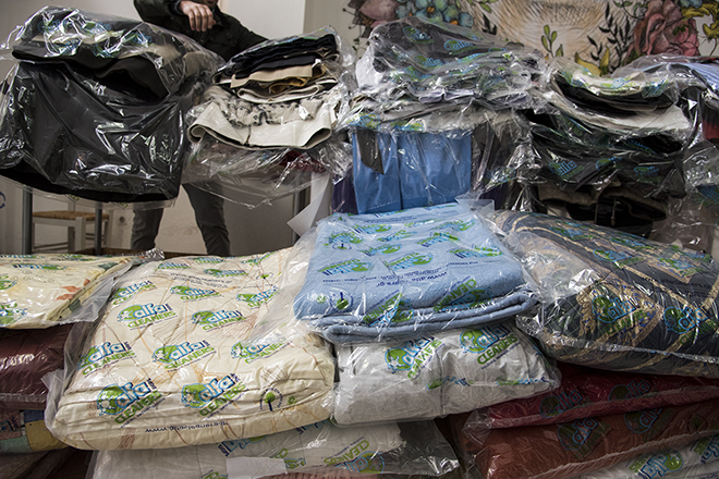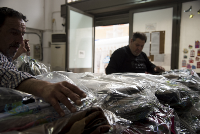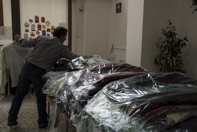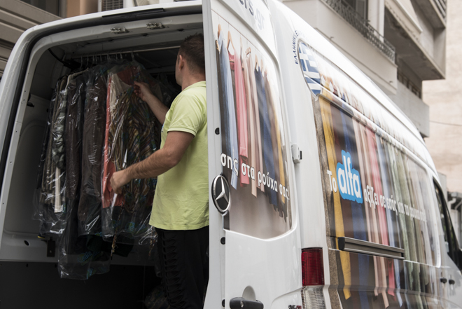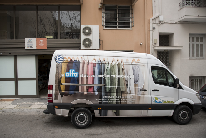 11.30. Οι πόρτες του φορτηγού έχουν ανοίξει. Από μέσα, ο οδηγός με τη βοήθεια της ομάδας της ΜΚΟ ξεφορτώνουν μερικές εκατοντάδες ρούχων. Είναι όλα καλοφτιαγμένα, σιδερωμένα, πλυμένα, με τη ζελατίνα τους βαλμένα στις κρεμάστρες τους. Το λογότυπο γράφει Alfa Cleaners.