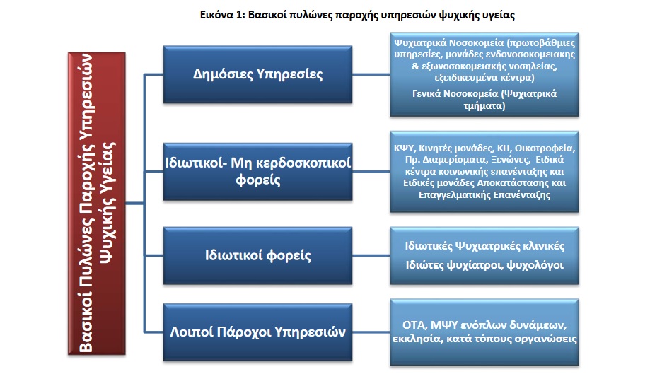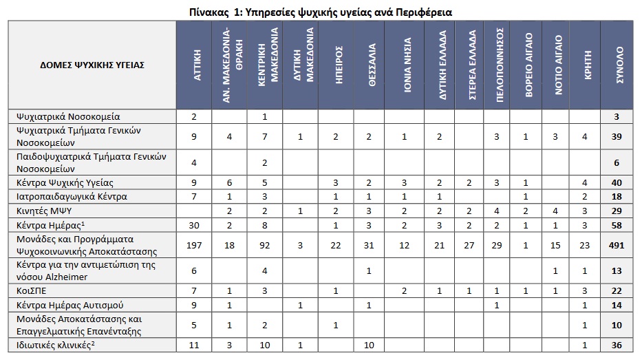 Χωρίς σαφές πλάνο, χωρίς σχεδιασμό, χωρίς τομείς ευθύνης, οι δομές και οι υπηρεσίες ψυχικής υγείας αναπτύχθηκαν άναρχα, με αποτέλεσμα να υπάρχουν περιοχές της χώρας που δεν διαθέτουν τίποτα και άλλες περιοχές όπου παρατηρείται υψηλή συγκέντρωση. Ενδεικτικά, η μεγαλύτερη συσσώρευση δομών ψυχικής υγείας επικρατεί στις περιφέρειες Αττικής και Κεντρικής Μακεδονίας, ενώ αντίθετα υπάρχει σημαντική υστέρηση υπηρεσιών στις περιφέρειες της Δυτικής Μακεδονίας και Βορείου Αιγαίου. Η ίδια εικόνα επαναλαμβάνεται και ως προς την παροχή υπηρεσιών πρωτοβάθμιας φροντίδας ψυχικής υγείας με την Αττική να έχει συγκεντρώσει περίπου το 50% των Κέντρων Ημέρας από αυτά που συνολικά υπάρχουν σε όλη τη χώρα και τις περιφέρειες της Δυτικής Μακεδονίας και του Νοτίου Αιγαίου να μην διαθέτουν κανένα Κέντρο Ψυχικής Υγείας.