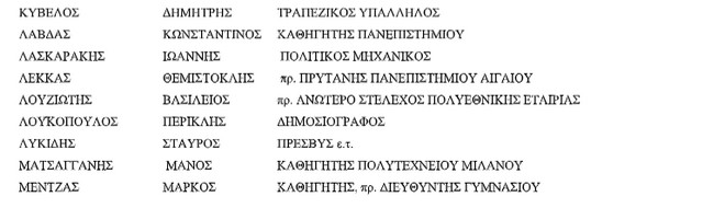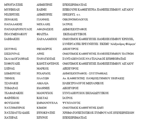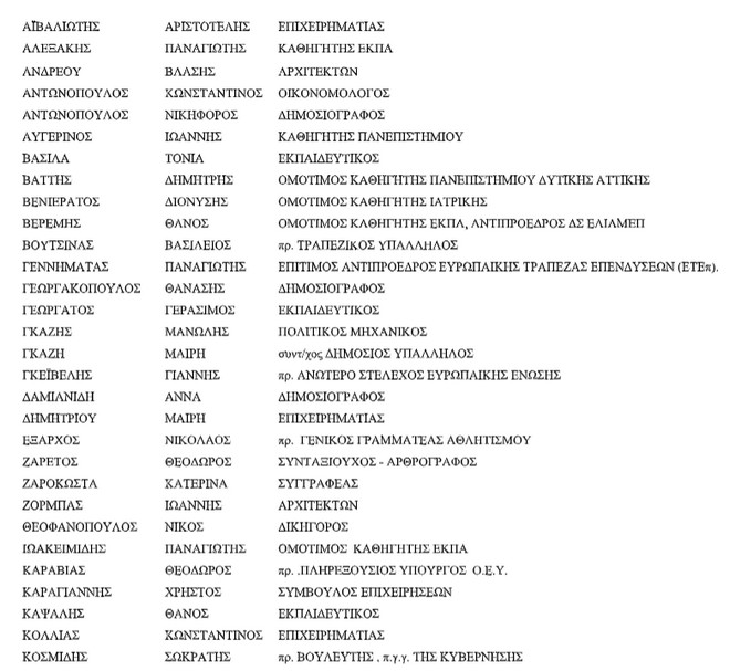Μεταξύ όσων υπογράφουν είναι οι Θάνος Βερέμης, Παναγιώτης Γεννηματάς, Νίκος Έξαρχος, Παναγιώτης Ιωακειμίδης, Σωκράτης Κοσμίδης, Κωνσταντίνος Λάβδας, Θεμιστοκλής Λέκκας, Μάνος Ματσαγγάνης, Δημήτρης Νεζερίτης, Θεόδωρος Σιούφας, Κωνσταντίνος Σοφούλης, Ριχάρδος Σωμερίτης, Τήνιος Πλάτων, Κίμων Χατζημπίρος.