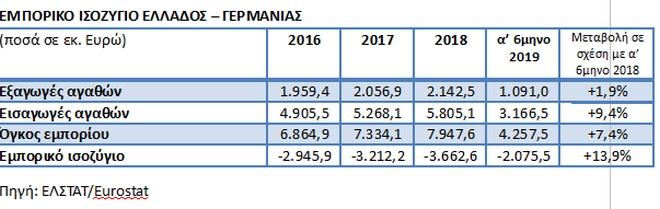Κατά το α’ εξάμηνο του 2019, οι ελληνικές εξαγωγές συνέχισαν τη σταθερά ανοδική τους πορεία: +1,9% σε σχέση με το αντίστοιχο διάστημα του 2018. Ωστόσο, εντονότερα ανοδικά κινήθηκαν οι εισαγωγές της Ελλάδας από τη Γερμανία (+9,4%) με αποτέλεσμα το εμπορικό ισοζύγιο να παραμένει έντονα ελλειμματικό για τη χώρα μας.