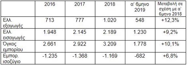 Κατά το α’ εξάμηνο του 2019, οι ελληνικές εξαγωγές συνέχισαν την ανοδική τους πορεία: +12,3% σε σχέση με το αντίστοιχο διάστημα του 2018. Ωστόσο, ανοδικά κινήθηκαν και οι εισαγωγές της Ελλάδας από τη Γαλλία (+9,2%) με αποτέλεσμα το εμπορικό ισοζύγιο να παραμένει έντονα ελλειμματικό για τη χώρα μας.