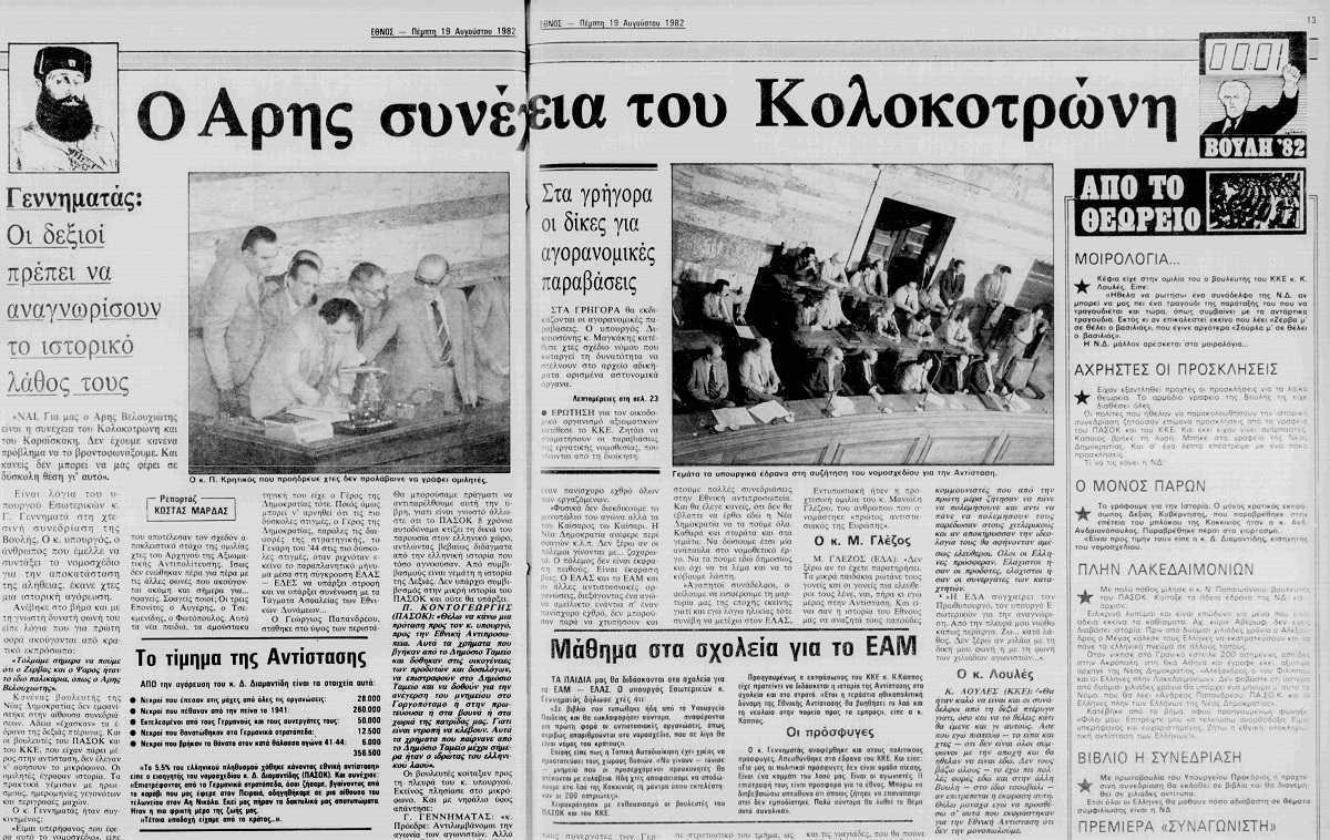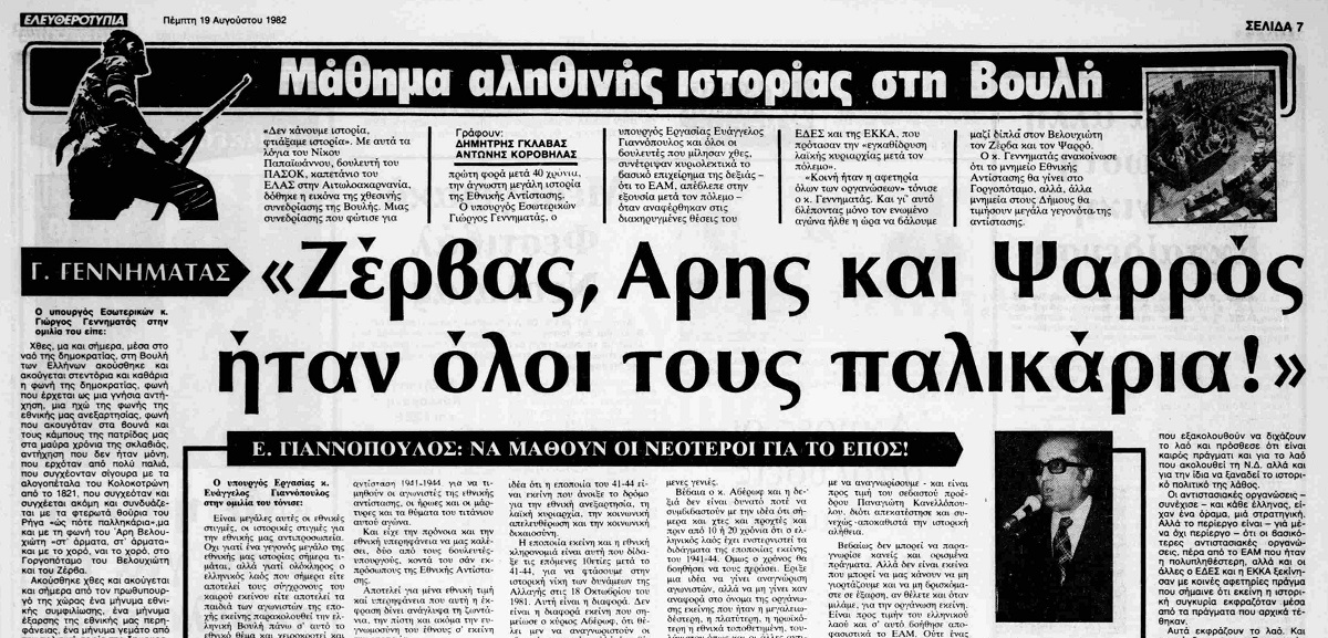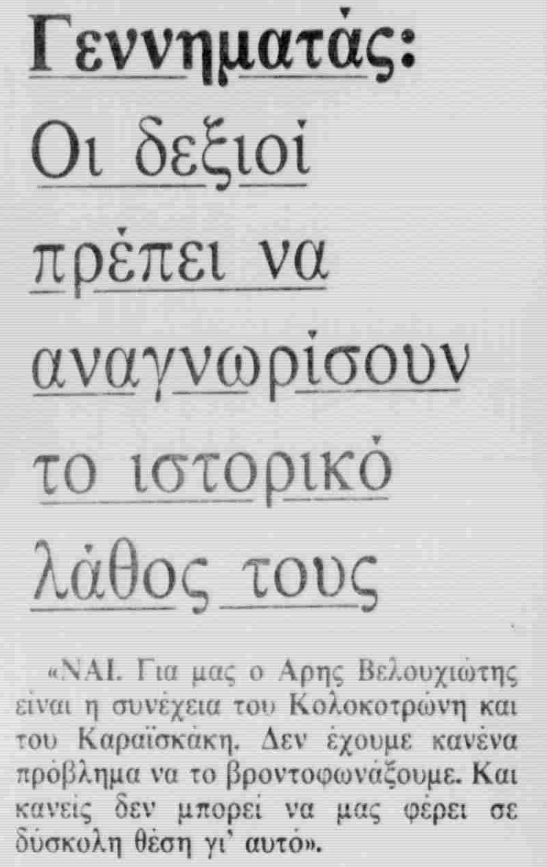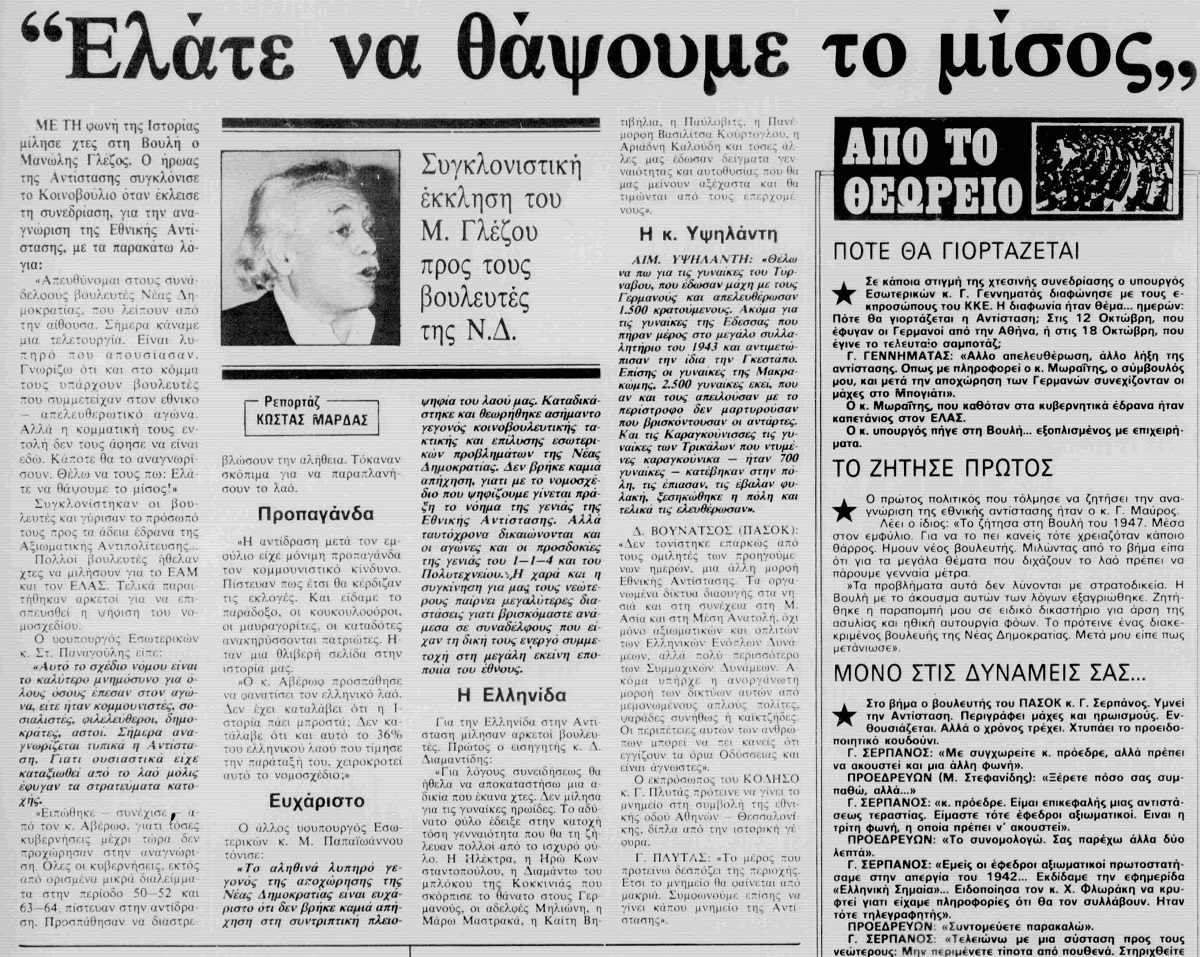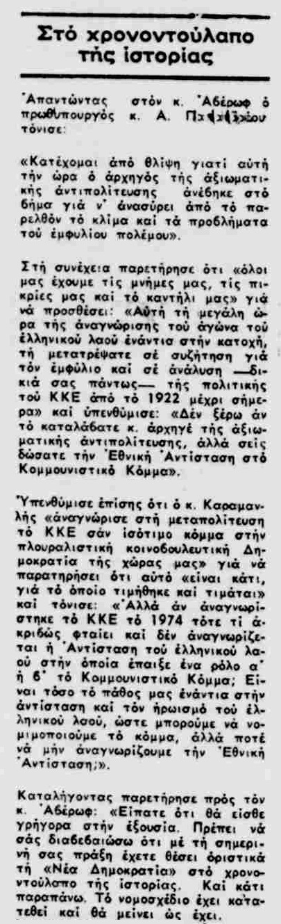 (…) Γιατί εκείνο που ουσιαστικά αναγνωρίζει και τιμά σήμερα η κυβέρνηση του ΠΑΣΟΚ δεν είναι η Αντίσταση, είναι η κατοχική δράση του κομμουνιστικού κόμματος”.