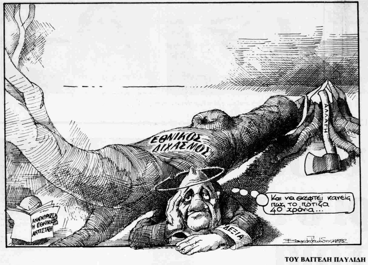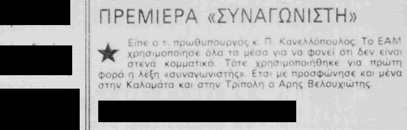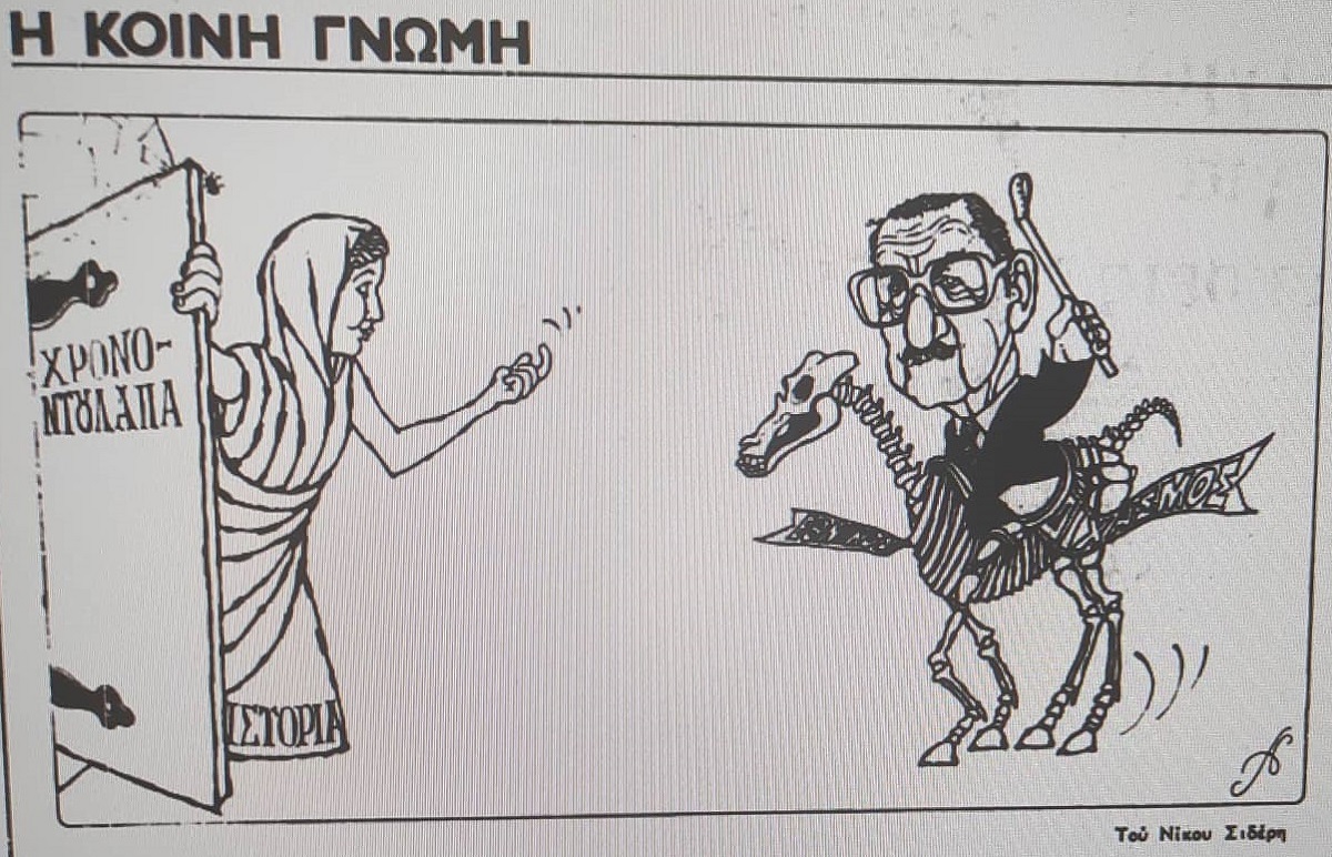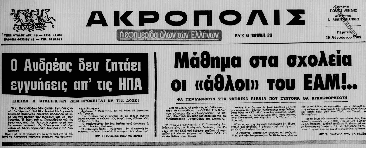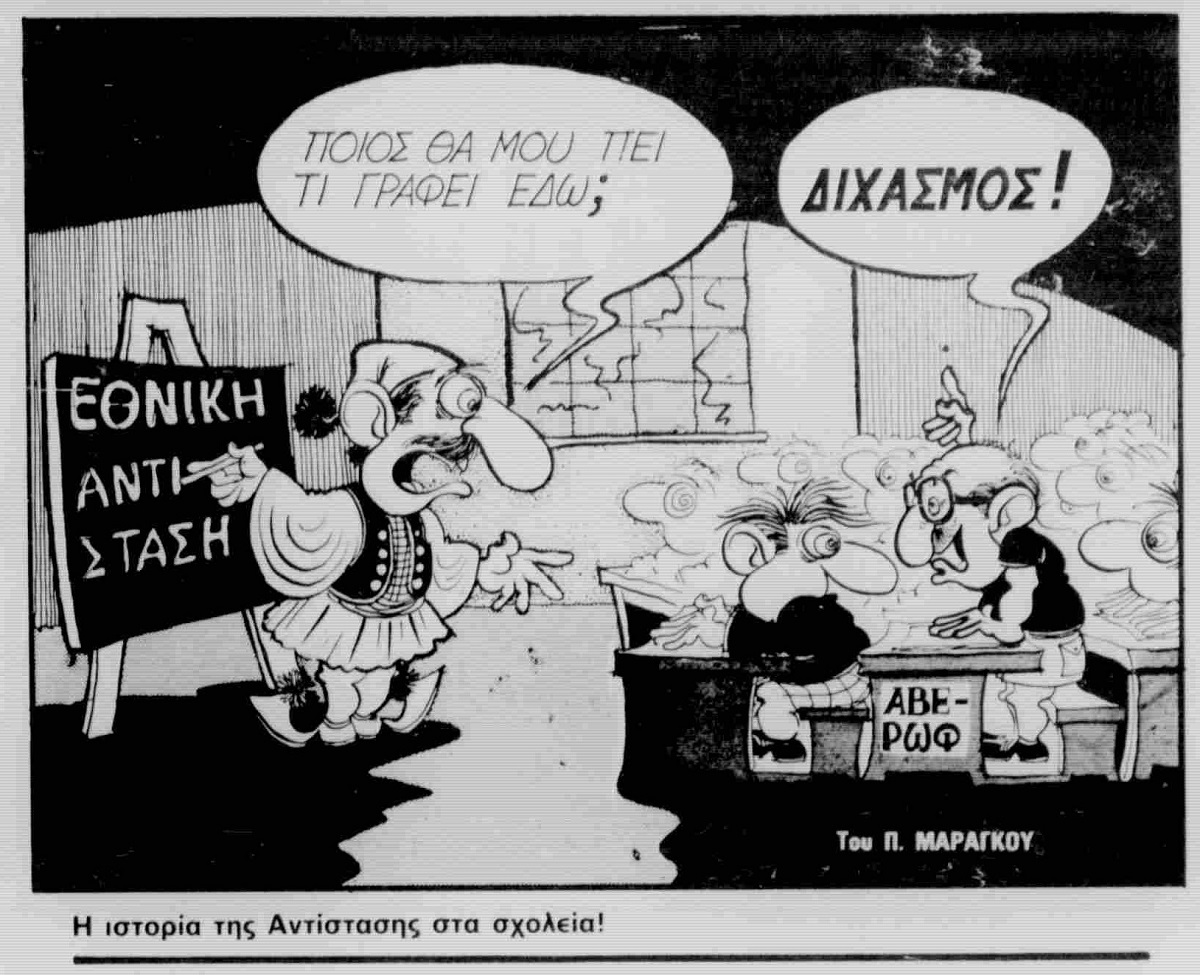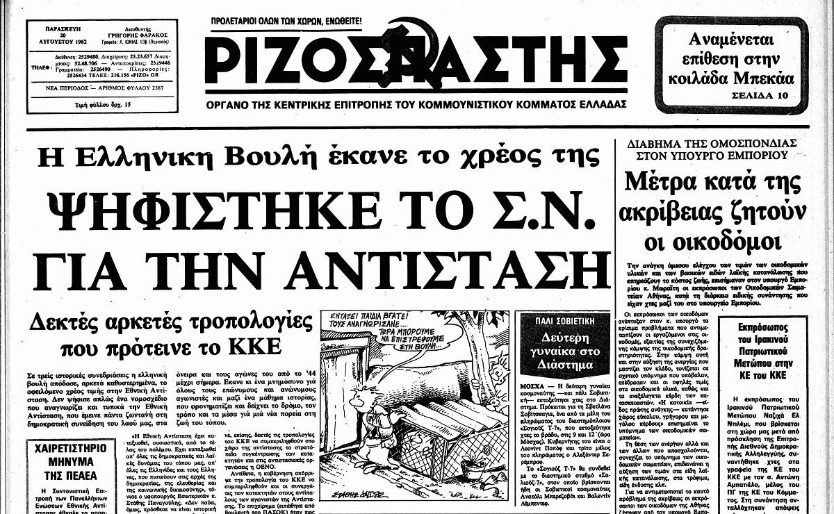 (…) Γιατί εκείνο που ουσιαστικά αναγνωρίζει και τιμά σήμερα η κυβέρνηση του ΠΑΣΟΚ δεν είναι η Αντίσταση, είναι η κατοχική δράση του κομμουνιστικού κόμματος”.