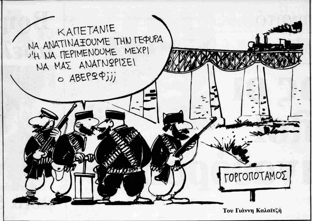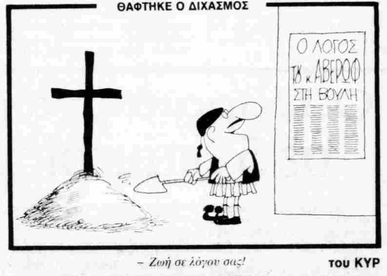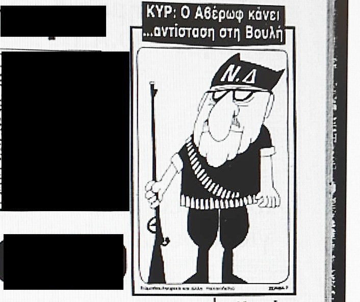 Η στάση του Αβέρωφ και της Νέας Δημοκρατίας, δεν θα μπορούσε να περάσει απαρατήρητη και από τους γελοιογράφους της εποχής, όπως τον ΚΥΡ και τον Γιάννη Καλαϊτζή της Ελευθεροτυπίας, τον Νίκο Σιδέρη και τον Βαγγέλη Παυλίδη στο Βήμα και τον Πάνο Μαραγκό στο Έθνος: