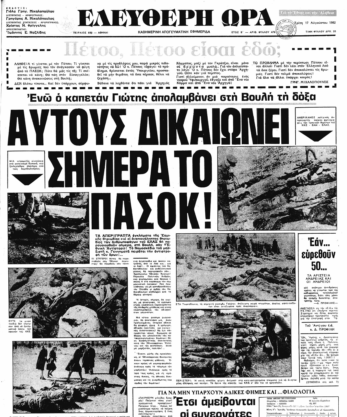 Πέρα από τα πρωτοσέλιδα, έχει ακόμα μεγαλύτερο ενδιαφέρον να δει κανείς και όσα καταγράφηκαν στα ρεπορτάζ της εποχής. Στις 17 Αυγούστου, ο Ανδρέας Παπανδρέου μίλησε πρώτος στη Βουλή, εκφωνώντας τον ιστορικό πια λόγο του, κατά παρέκκλιση, καθώς εκείνος που έφερε το νομοσχέδιο προς ψήφιση ήταν ο υπουργός Εσωτερικών, Γιώργος Γεννηματάς, και επομένως εκείνος έπρεπε να μιλήσει πρώτος.