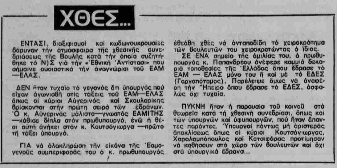 Στο ίδιο ρεπορτάζ, στη στήλη δεξιά “Από το θεωρείο”, διαβάζουμε και τα λόγια του ιστορικού στελέχους του Κέντρου, Γεώργιου Μαύρου, που τότε είχε βρεθεί στα έδρανα της Βουλής ως βουλευτής του ΠΑΣΟΚ:
