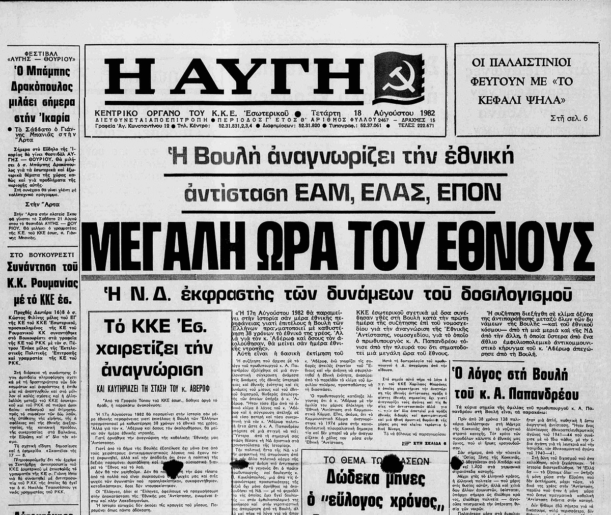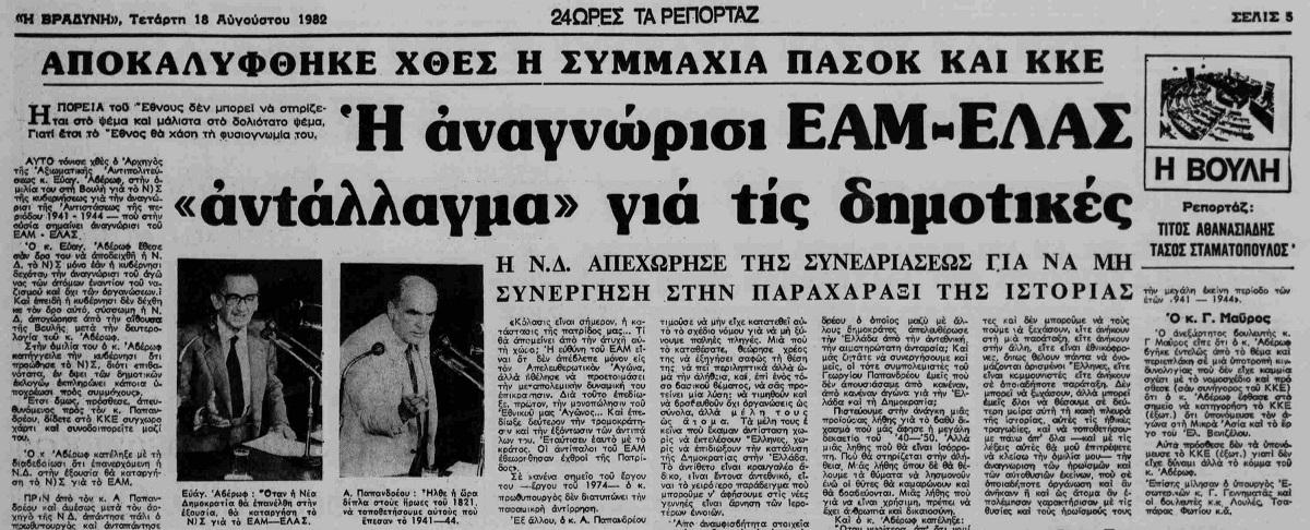 Στη Μεταπολίτευση το θέμα ανακινήθηκε, τα εκκρεμή ζητήματα έψαχναν τη διευθέτησή τους και μια μέρα σαν σήμερα, στις 23 Αυγούστου του 1982, η Εθνική Αντίσταση αναγνωρίστηκε με τον νόμο 1285 που ψήφισε η Βουλή, με πρωτοβουλία της κυβέρνησης ΠΑΣΟΚ. Υπέρ ψήφισαν το ΠΑΣΟΚ και το ΚΚΕ, ενώ η Νέα Δημοκρατία μετά την ομιλία του αρχηγού της Ευάγγελου Αβέρωφ, αποχώρησε από την αίθουσα, πλην του Παναγιώτη Κανελλόπουλου, ο οποίος αφού στηλίτευσε τη στάση των ομοϊδεατών του, ψήφισε υπέρ της συνολικής αναγνώρισης της Εθνικής Αντίστασης.