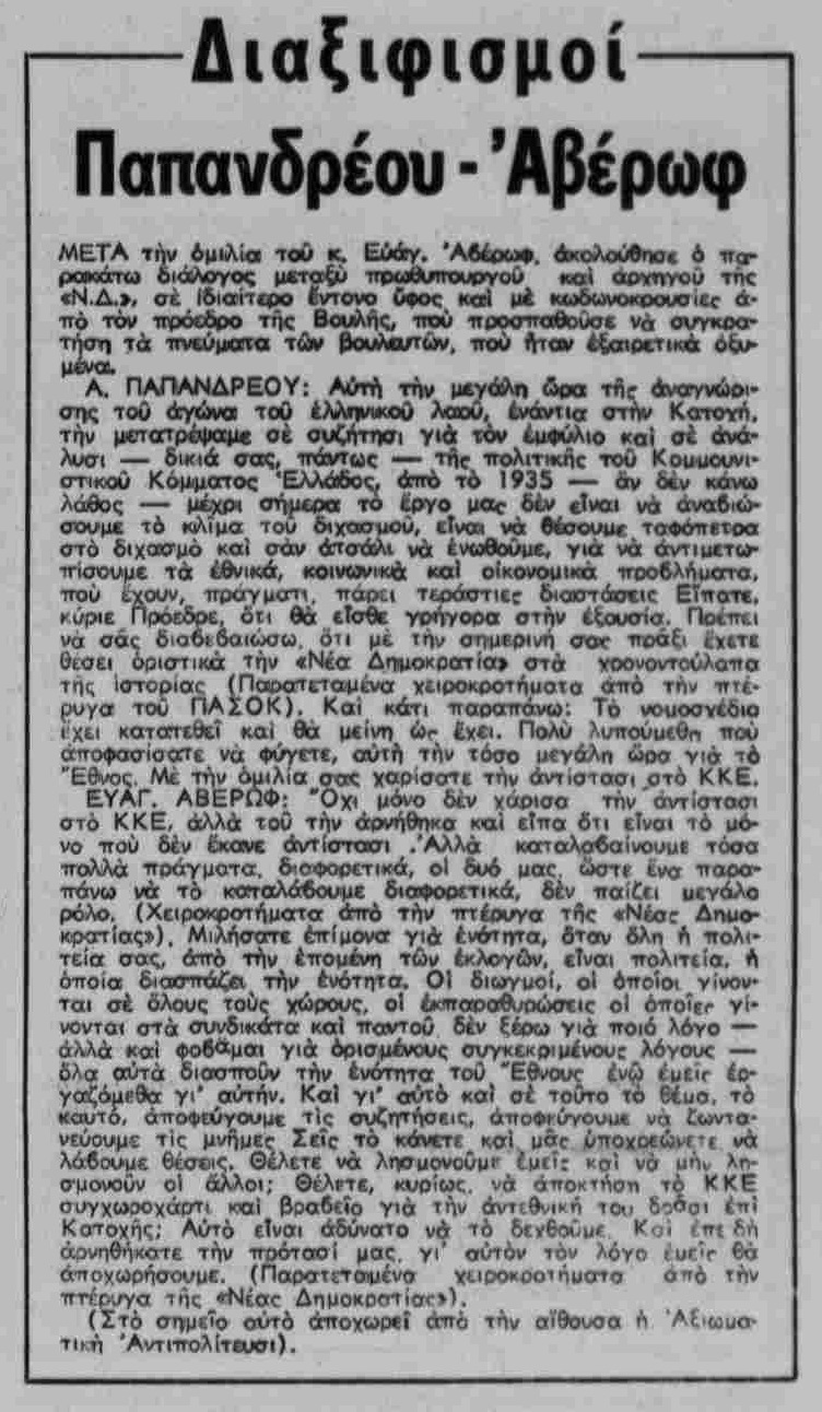 Επίσης, στην ομιλία του ο Αβέρωφ υποσχέθηκε ότι μόλις ερχόταν στην εξουσία, ότι θα έφερνε νομοσχέδιο που θα καταργούσε αυτόν τον νόμο. Μετά την ομιλία του, όπως μας πληροφορεί η Βραδυνή, υπήρξε έντονος φραστικός διάλογος με τον Ανδρέα Παπανδρέου, όπου απατώντας στην έγκλιση του τότε πρωθυπουργού ότι “με την ομιλία σας χαρίσατε την αντίσταση στο ΚΚΕ”, ο Αβέρωφ απάντησε χαρακτηριστικά: