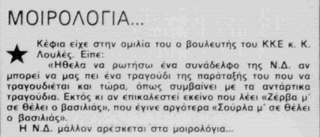 Ενώ ένα ακόμη ενδιαφέρον μικροπολιτικό με πρωταγωνιστή τον τότε βουλευτή του ΚΚΕ, Κώστα Λουλέ: