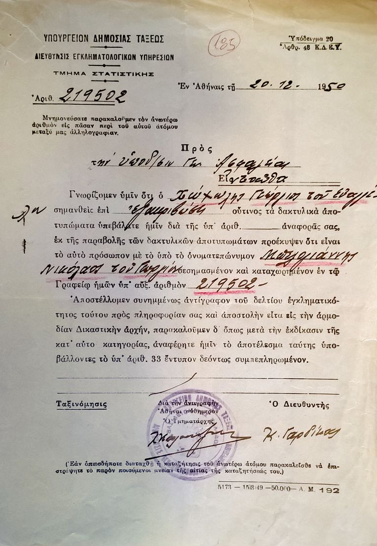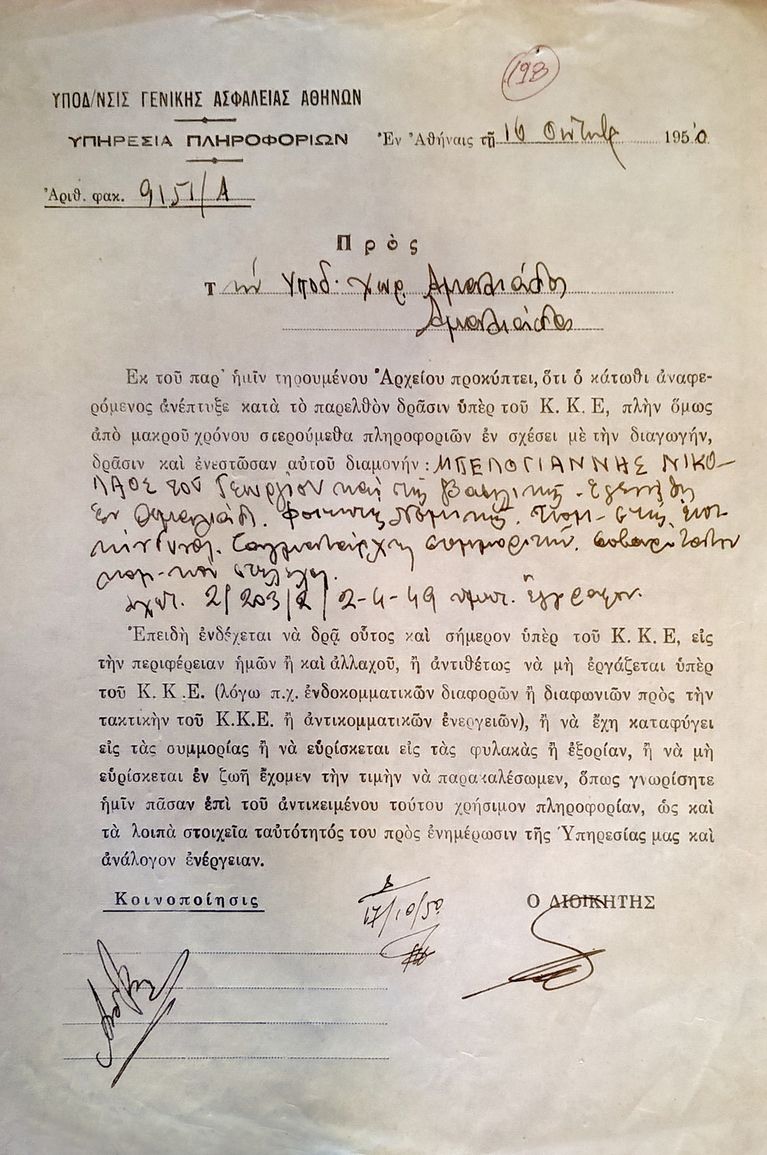Το παρακάτω έγγραφο αποστέλλεται από τη Διεύθυνση Εγληματολογικών Υπηρεσιών του Υπουργείου Δημοσίας Τάξης στην Υποδιεύθυνση της Ασφάλειας. Από τις 20 Δεκεμβρίου του 1950 και μετά, ο Μπελογιάννης περνά τις (τελευταίες στη ζωή) μέρες του μεταξύ φυλακής και δικαστικής αίθουσας.