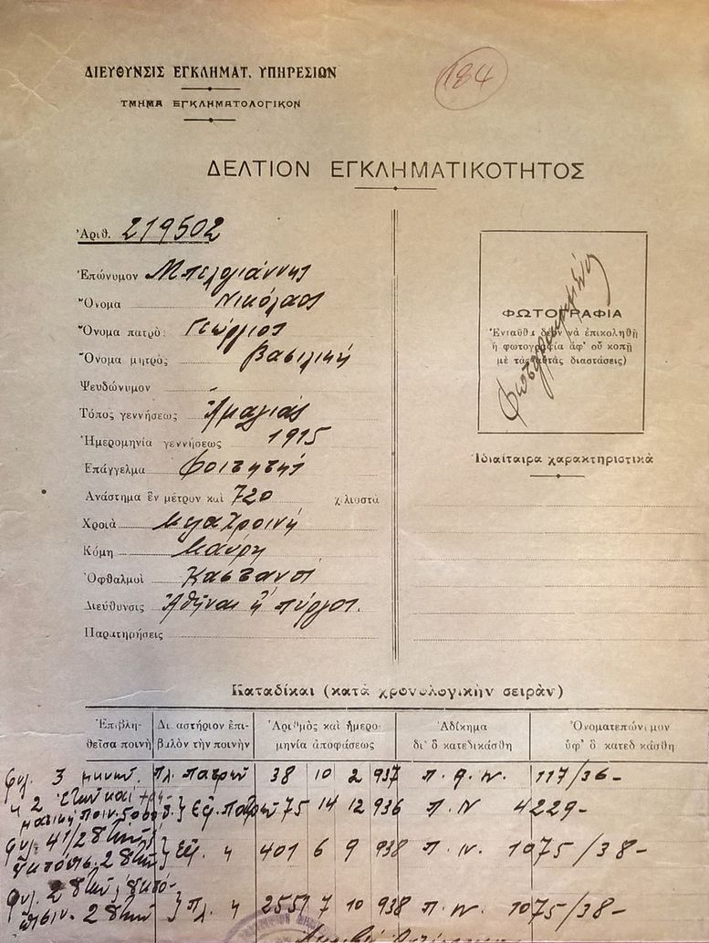 Εννοείται ότι ο Μπελογιάννης εκείνη την εποχή δεν κυκλοφορούσε στην Αθήνα με την κανονική του ταυτότητα. Είχε φροντίσει να προμηθευτεί πλαστή με τα στοιχεία Γεώργιος Χόχολης του Ευαγγέλου και της Αλεξάνδρας, “γεννημένος το 1913 εις Ζέλιτσα Καλαμών και κατοικών στην οδό Μαυρομιχάλη 47”. Εννοείται, επίσης, ότι οι Αρχές γνώριζαν άριστα το σύνολο της προπολεμικής του πολιτικής δραστηριότητας. Το Δελτίο Εγκληματικότητας του Μπελογιάννη με τον αριθμό 219502 δεν άφηνε περιθώρια για παρερμηνείες, καθώς σε αυτό αναγράφονταν και οι τέσσερις προπολεμικές καταδίκες του για κομμουνιστική δράση (όλες επί δικτατορίας Μεταξά, μεταξύ του 1936 και του 1938).