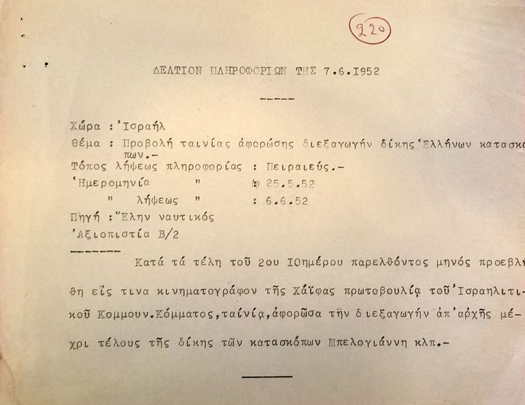 Σε δελτίο της Υπηρεσίας Πληροφοριών με ημερομηνία την 7η Ιουνίου 1952 (κάτι παραπάνω από δύο μήνες μετά την εκτέλεση) καταγράφεται ότι σε κινηματογράφο της Χάιφα στο Ισραήλ, μετά από πρωτοβουλία του Κομμουνιστικού Κόμματος της χώρας, έλαβε χώρα προβολή ταινίας που αφορούσε τη δίκη του Μπελογιάννη και των συντρόφων του.