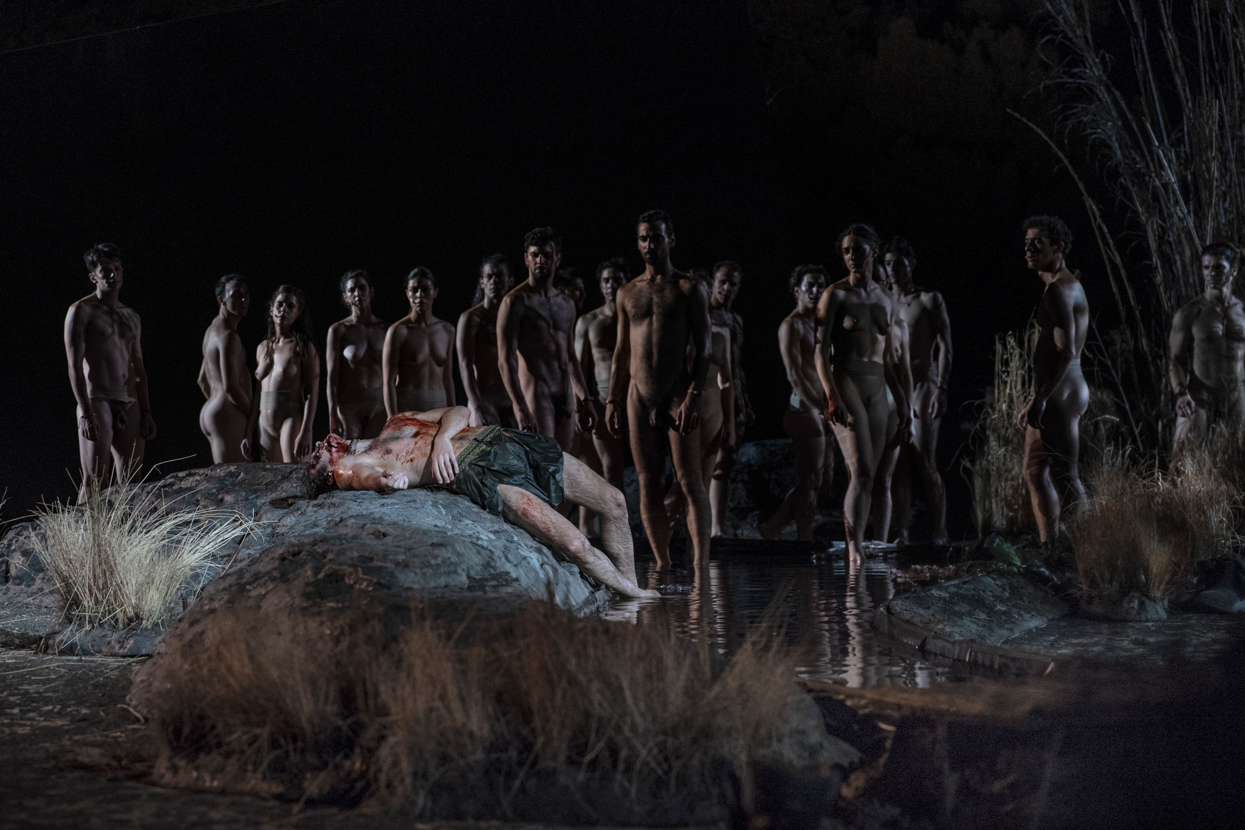 Δεν έλειψαν και σκηνές με queer ματιά και εξόχως τολμηρές στην αναπαράσταση ενός αρχαίου δράματος: η σκηνή του χορικού οργίου των νεαρών κυνηγών στο πίσω μέρος της σκηνής. Οι νεαροί άνδρες επιδίδονται σε ερωτικές πράξεις μεταξύ τους, θωπεύονται και φιλιούνται σε ένα όργιο που πρωτοστατεί η φύση τους, ενώ στον θανάσιμο τραυματισμό του αρχηγού τους απεκδύονται όλοι των ενδυμάτων τους. Μένουν γυμνοί μπροστά στη μανία του ανθρώπου και του θεού, γυμνοί μπροστά σε ό,τι ορίζει η μοίρα τους.